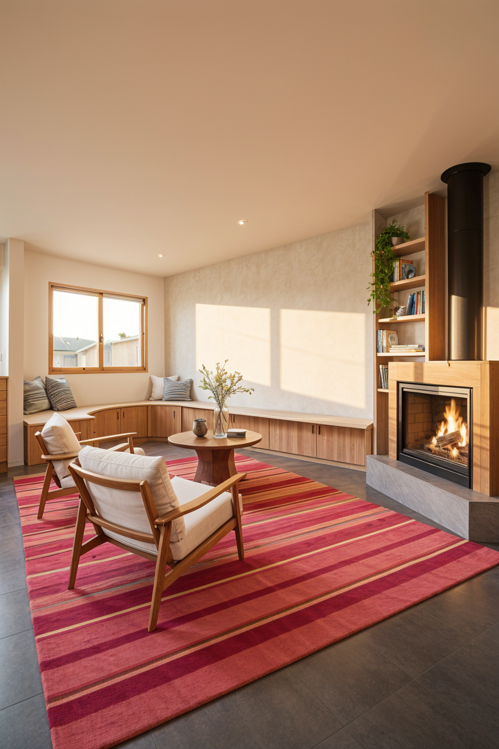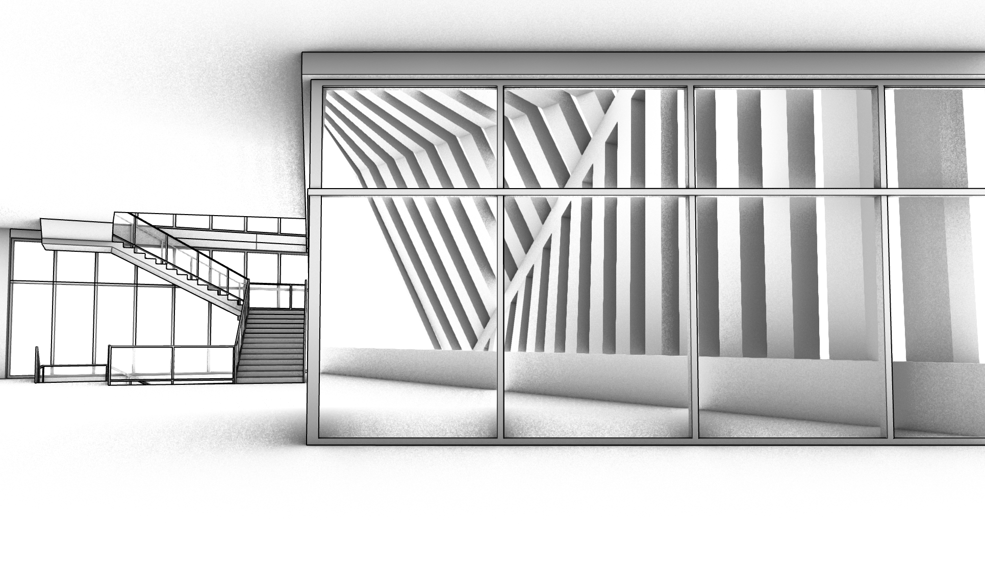render this scene with a beige matte aluminum facade and exposed concrete interior walls use soft daylight coming from the right side with realistic reflections on the glass apply a warm ceramic tile floor with subtle texture keep all geometry exactly the same including the stair railings and vertical structural fins do not change the proportions or design make the materials clean modern and minimalistic inspired by contemporary japanese plazas and oma detailing use sharp shadows soft ambient occlusion and high realism enhance the sense of depth behind the glass without adding extra elements