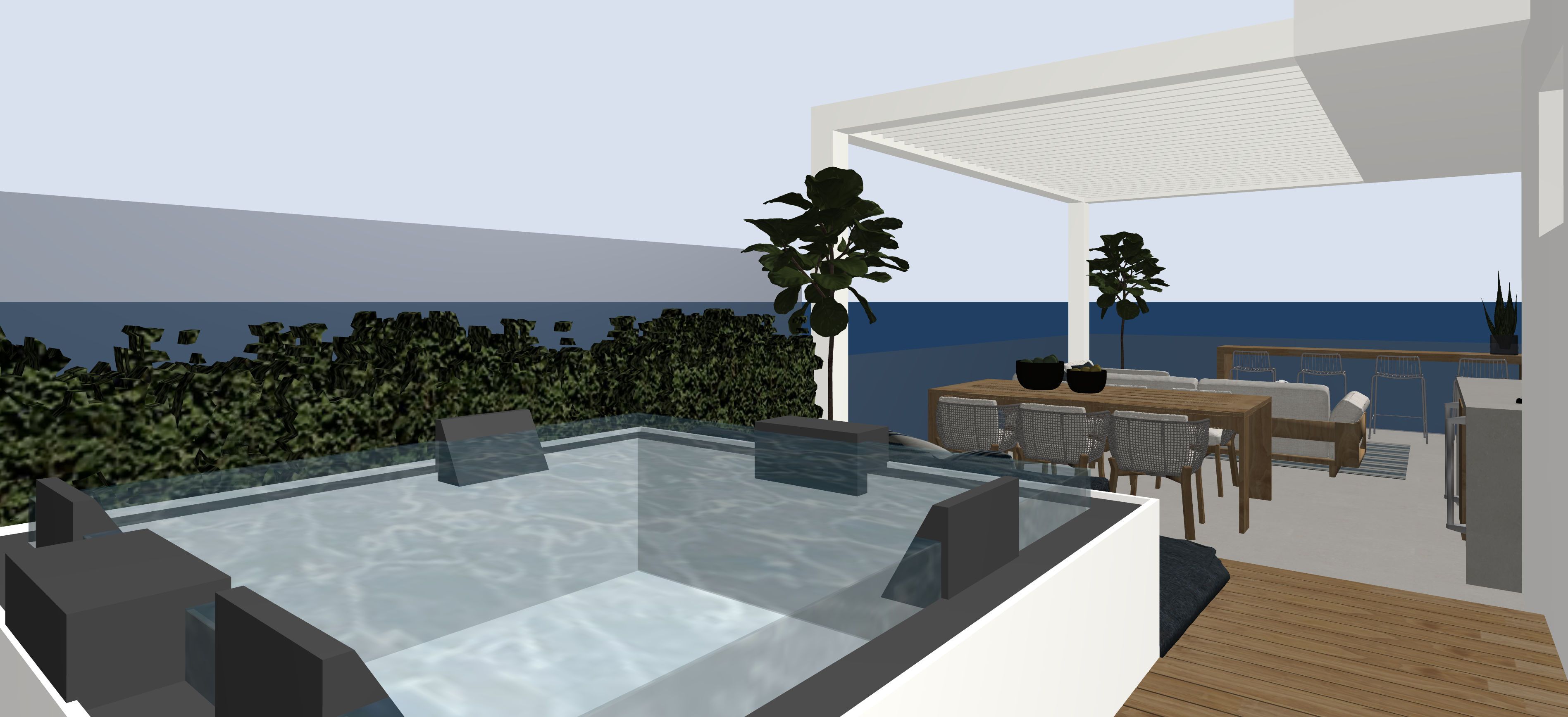terrazza con idromassaggio con vetro sulla parte alta e acqua a sfioro attorno alla vasca idromassaggio ci sono delle siepi e un parapetto in vetro la pedana della vasca idromassaggio e i tavoli sono in legno teak le sedie del tavolo sono in corda chiara e tessuto bianco caldo con gamba in legno il divano ha la struttura in legno ed in tessuto bianco caldo gli sgabelli in fondo sono cromati la pergotenda sopra al tavolo e al divano ha una strip led incassata perimetrale accesa il parapetto della terrazza in vetro metti uno sfondo con case e chiome di alberi e il mare in lontananza al tramonto metti qualche oggetto per ambiente conviviale esterno