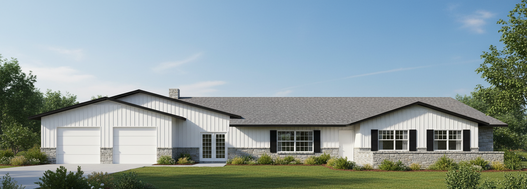the body of this house will be white board batten style siding installed vertically and from the top of the 40 high kusman stone wainscot around the base of the house the roof shingle will be a medium gray asphalt shingle the chimney adjacent to the garage will also have the existing kusman stone on it the white single hung windows will have black shutters on each side use black for the roof fascia the two openings on the left are section garage doors i need a stone wall to extend from the right side of the garage to the right 16 the glazed opening behind wall will be a pair of white arcadia doors with divided light add the chimney from my image with the kusman stone remove the stone wall extending from the right side of the house remove the stone on the house adjacet to the arcadia patio doors do not vary from the drawing inage i have loaded there is a window were the arcadia doors are shown change the window adjacent to the right side of the garage to a pair of arcadia doors with divided lights add muntins to the bottom sash of the single hung window only use the kusman stone veneer go back to the previous chimney location and remove the stone wall that extends from the right side of the house remove the stone wall in front of the house on the right side change the patio door on the right side of the elevation back to a pair of single hung windows to match the ones on the left side i need a stone wall to extend from the right side of the garage to the right 16 the glazed opening behind wall will be a pair of white arcadia doors with divided light remove the vertical stone columnon the left side of the arcadia doors