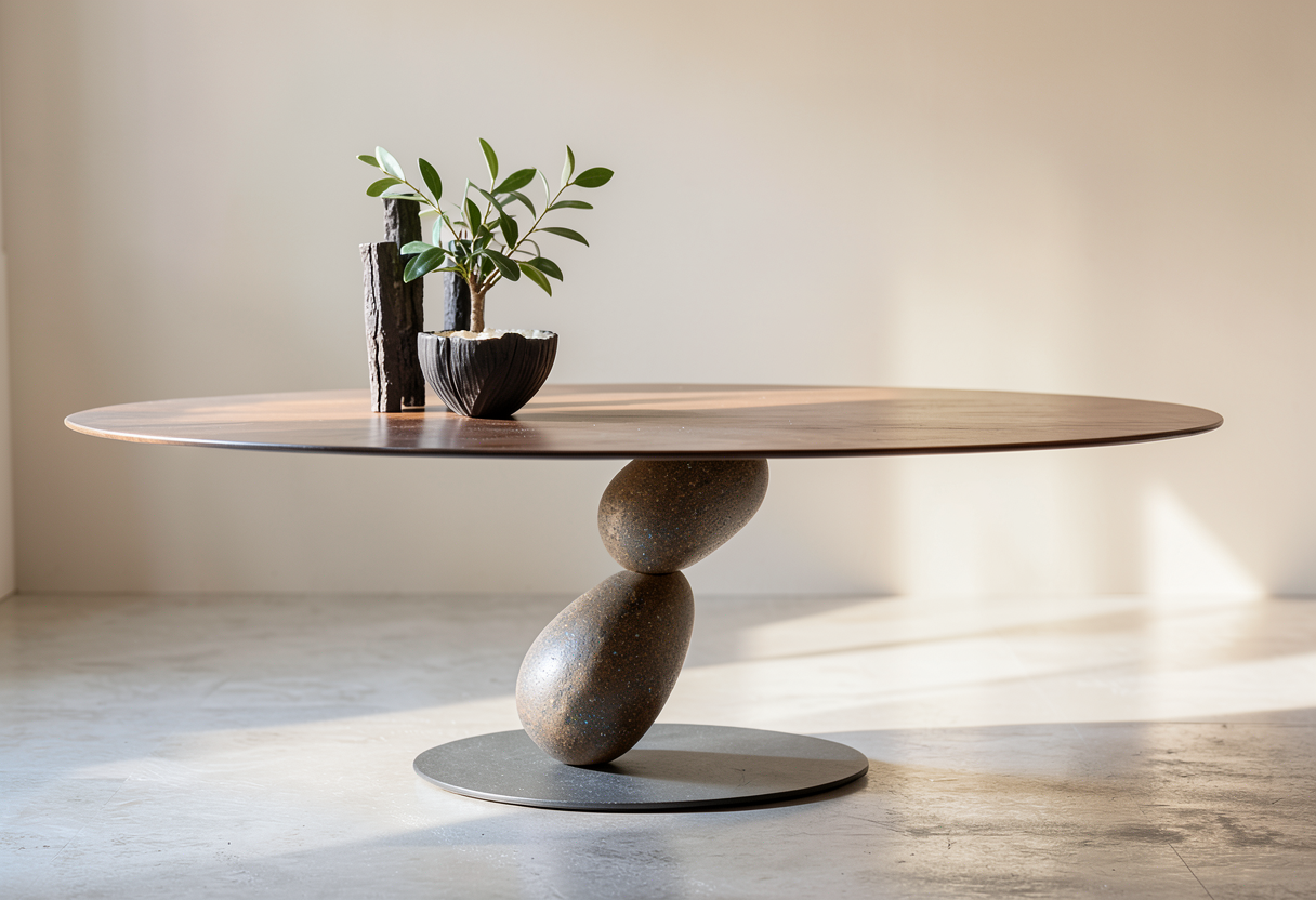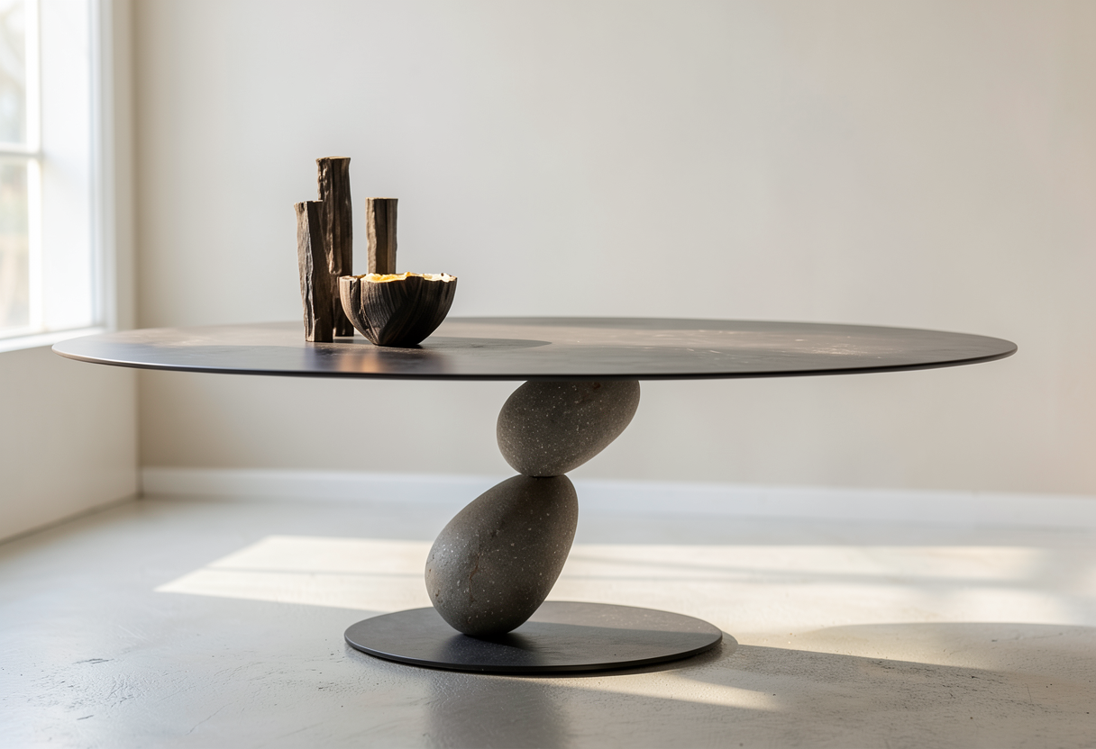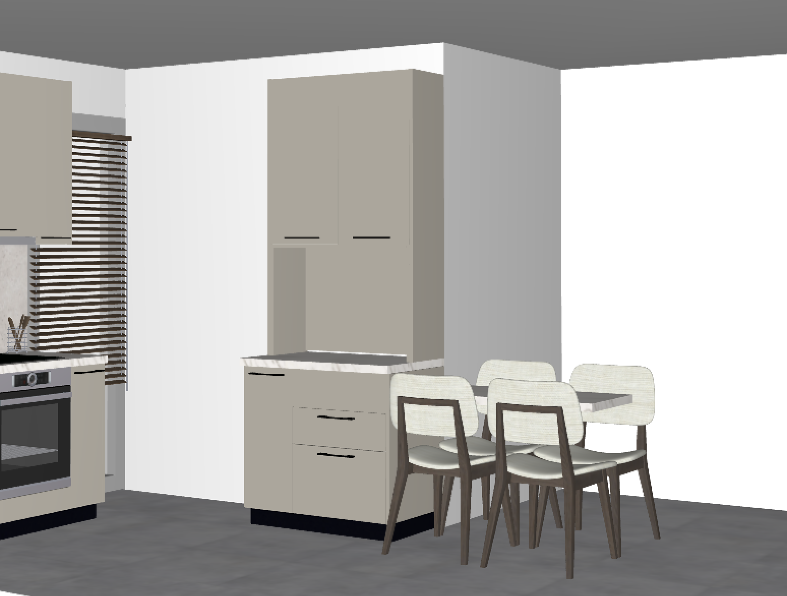 create a modern kitchen space with a minimalist vibe use a neutral color palette with shades of gray and beige design a sleek kitchen with light gray walls and a dark gray ceiling incorporate a silver refrigerator with subtle reflections place a contemporary dining table with light beige chairs featuring dark wooden legs the floor should be a polished gray tile add warm ambient lighting to enhance a cozy and inviting atmosphere keep the overall aesthetic clean and sophisticated with hints of light reflecting off surfaces for a touch of elegance