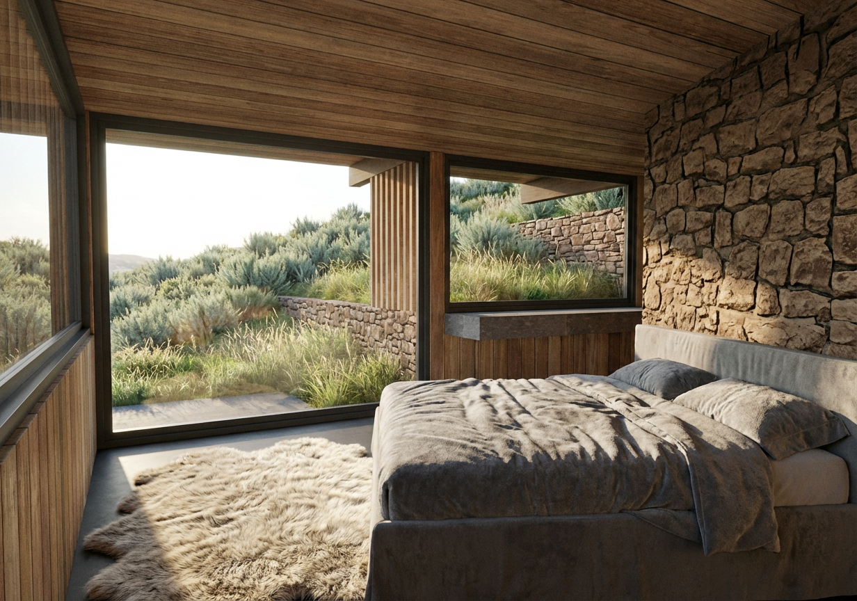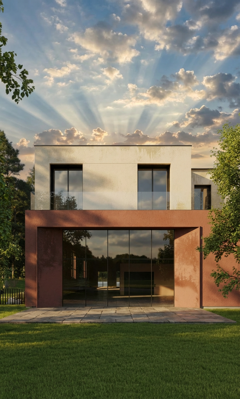 can you add a wooden patio and maybe enhance the sky with some clouds and rays of sun hitting the villa from the side