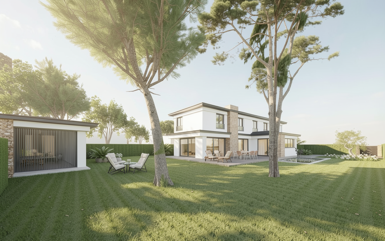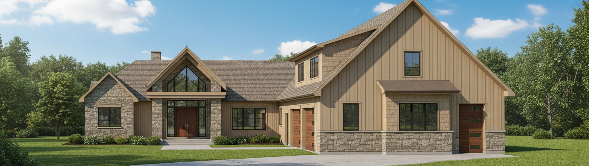 white siding black windows white brick