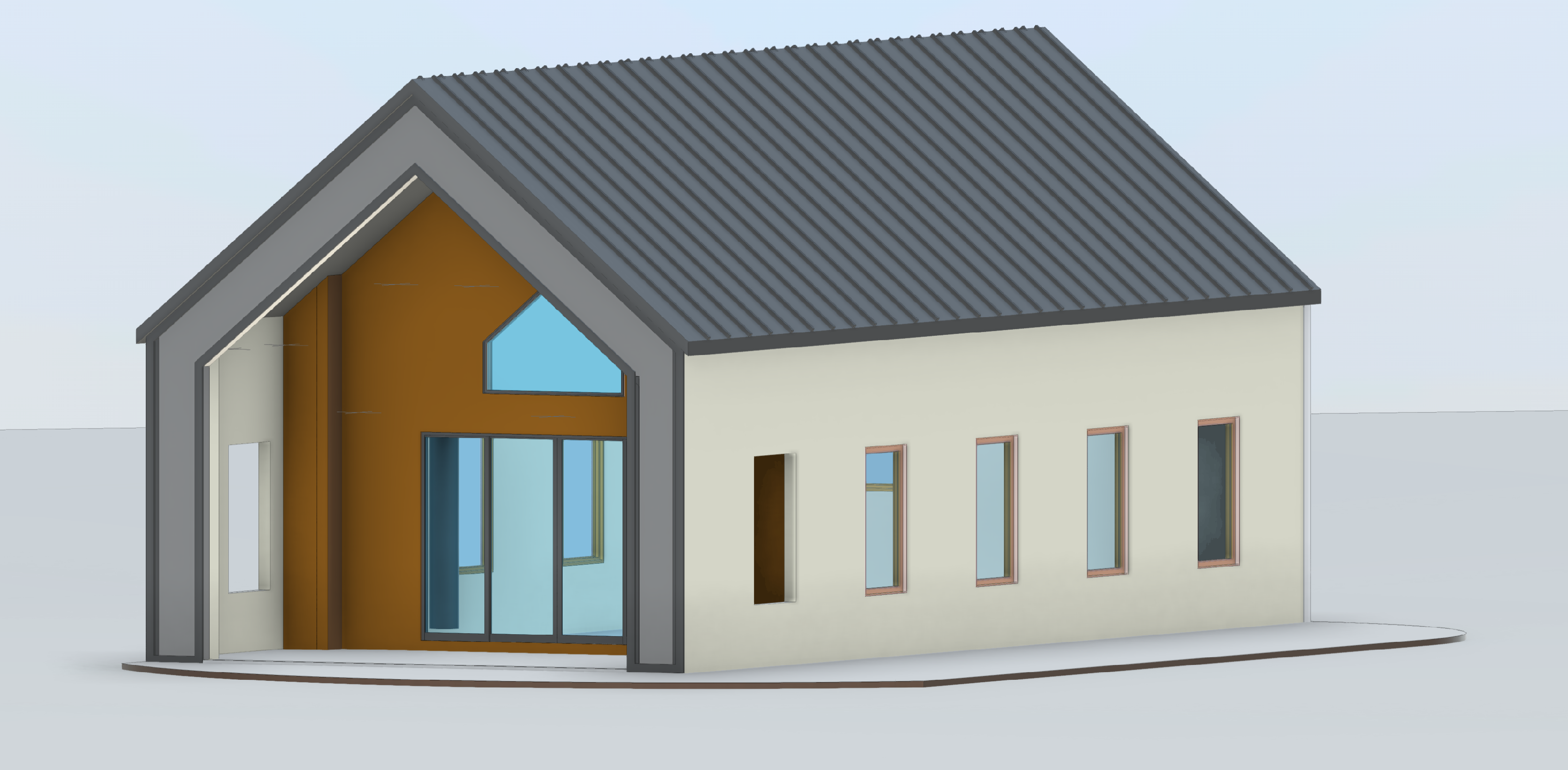 spring time late afternoon black frames trees more realistic at the background show different height of trees inside the buildings show furniture the windows are darker the lights in landscape should be realistic and metal material natural wood horizontal siding dark gray metal standing seam roof 100 strength sidewalk leading from center door patio