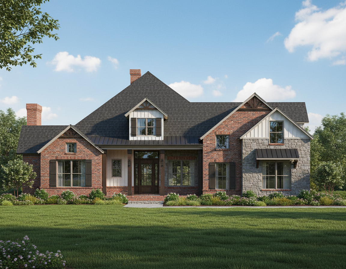 charming house with vertical board and batten siding red brick stone dark metal roof accent above porch and awning above window only dark shingle roof dark shutters dark cedar post and accents dark cedar front door with windows and sidelights