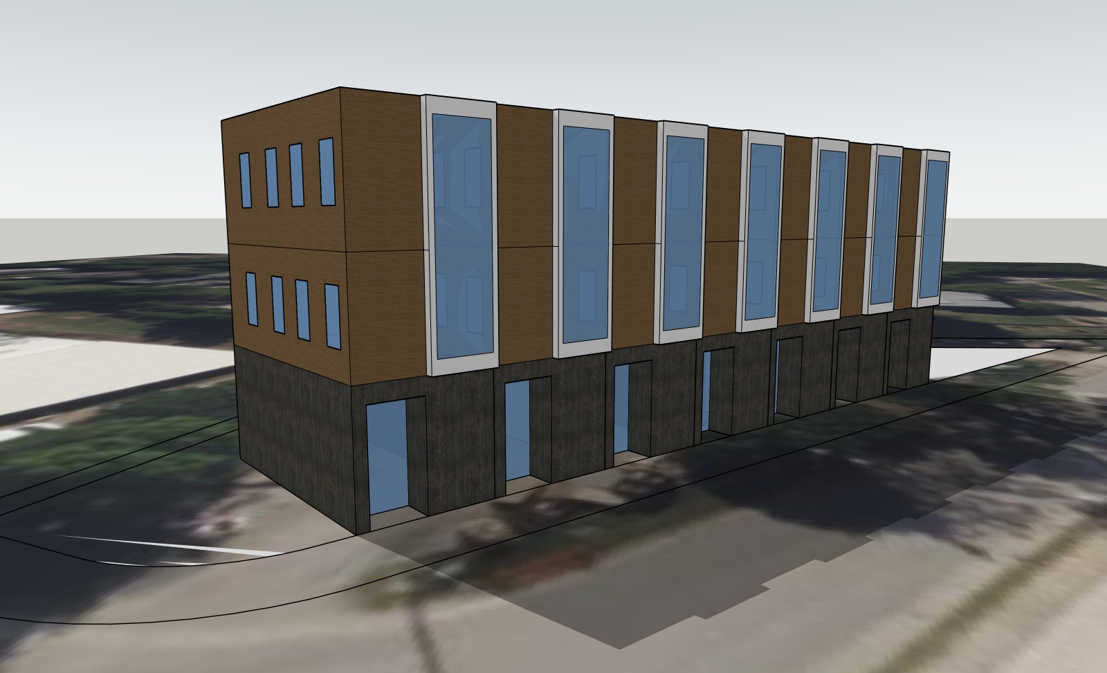 need a photoreal rendering for an urban modernist townhouse scheme on this curved corner lot between residential and warehouse districts use the gis overlay image for context where possible keep this photot real a dusk shot with windows providing a warm glow provide some street trees and use a combination of brick cladding at the lower level and wood cladding above trim and windows should be black