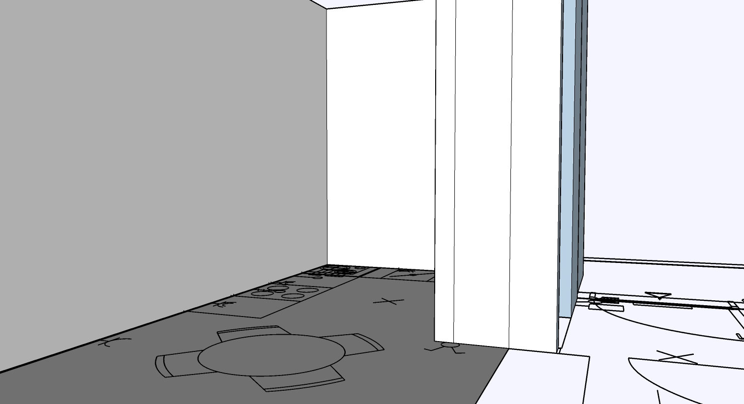 interior shot bright modern small kitchen l shaped layout along two walls matte white cabinets without handles light wood accents light stone countertop built in induction cooktop and sink tall cabinet with integrated fridge minimalistic design in the foreground a round white dining table with four simple chairs scandinavian style white seats wooden legs light wooden floor clean walls soft natural daylight coming from the right side neutral colors photorealistic interior high quality render based on existing layout keep proportions and camera angle