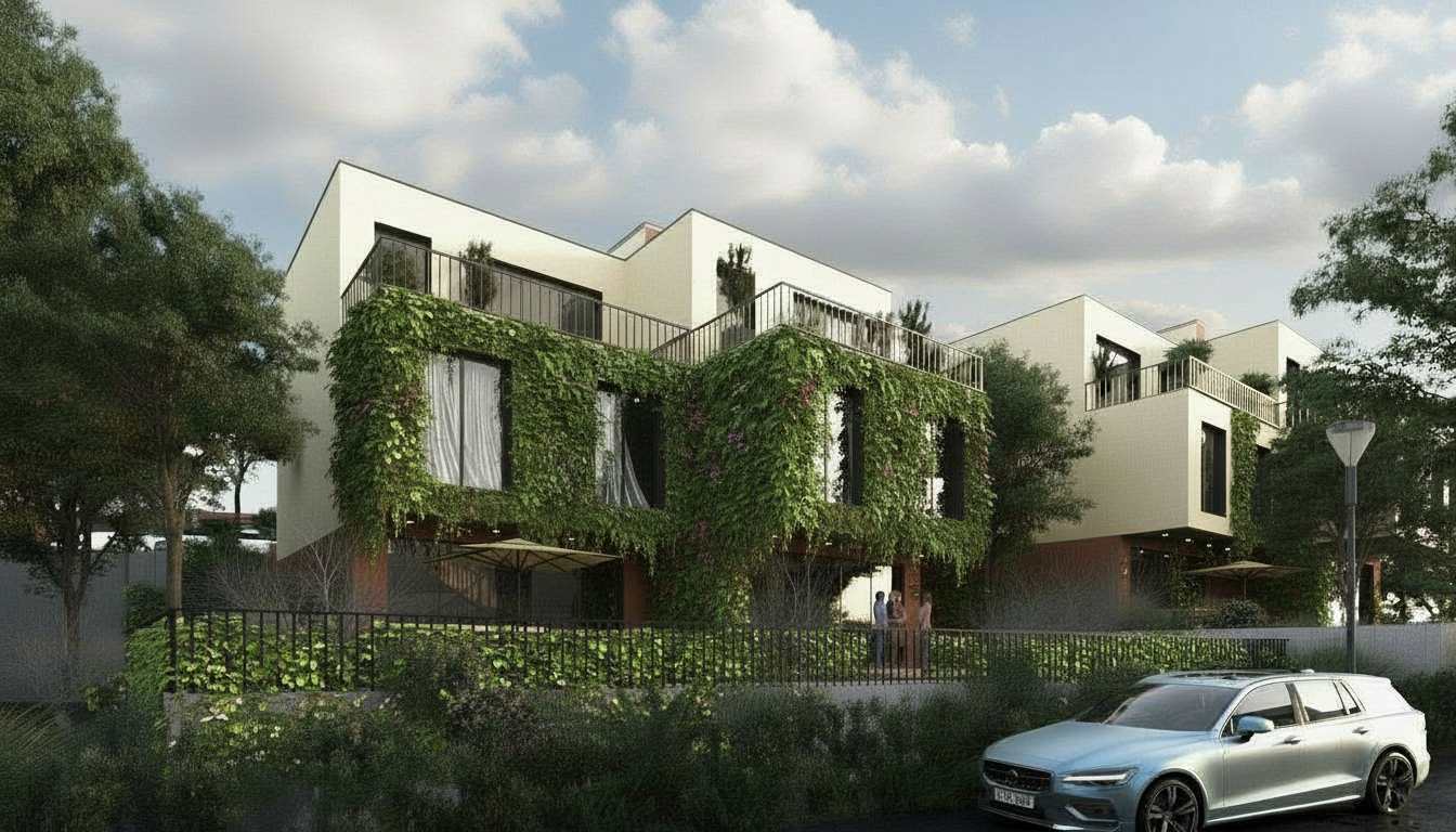 render a modern urban apartment building with a sleek and stylish design the fa ade is made of light gray brick giving it a contemporary look large windows with reflective glass are framed in matte black creating a striking contrast each balcony is lined with transparent glass railings allowing a view of the vibrant cityscape the entrance features tall glass doors that invite guests in with a welcoming ambiance the atmosphere is lively and energetic set during a bright sunny day with a clear blue sky accentuate the scene with soft natural lighting and subtle shadows