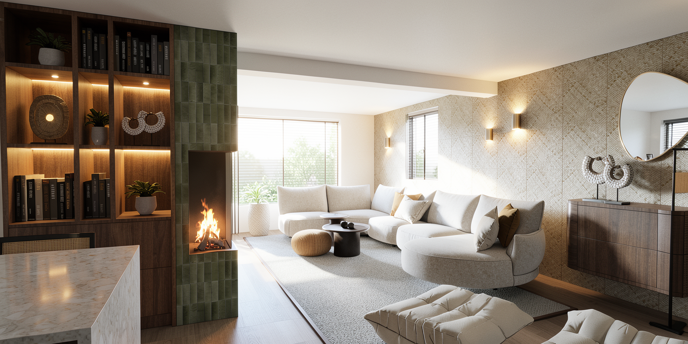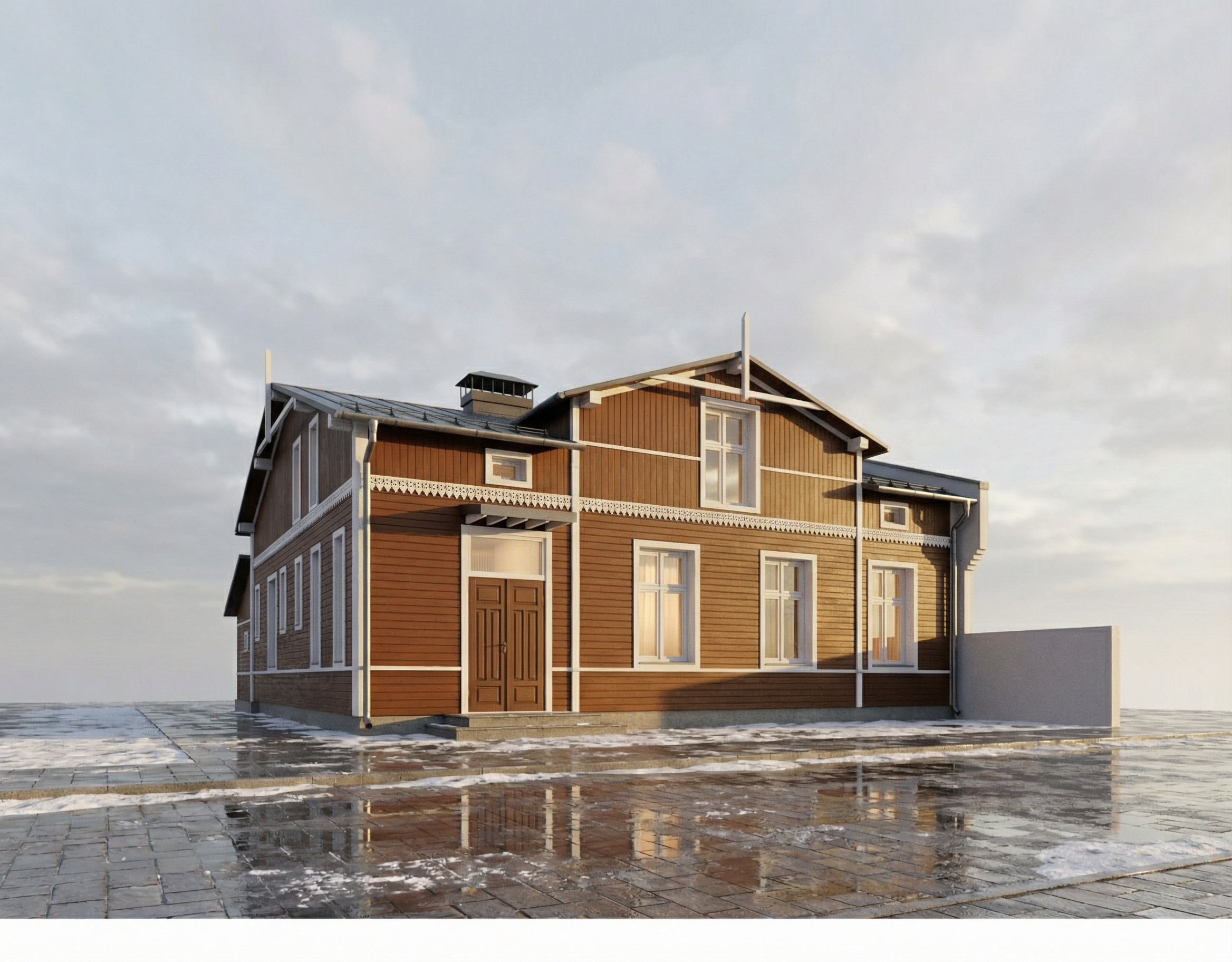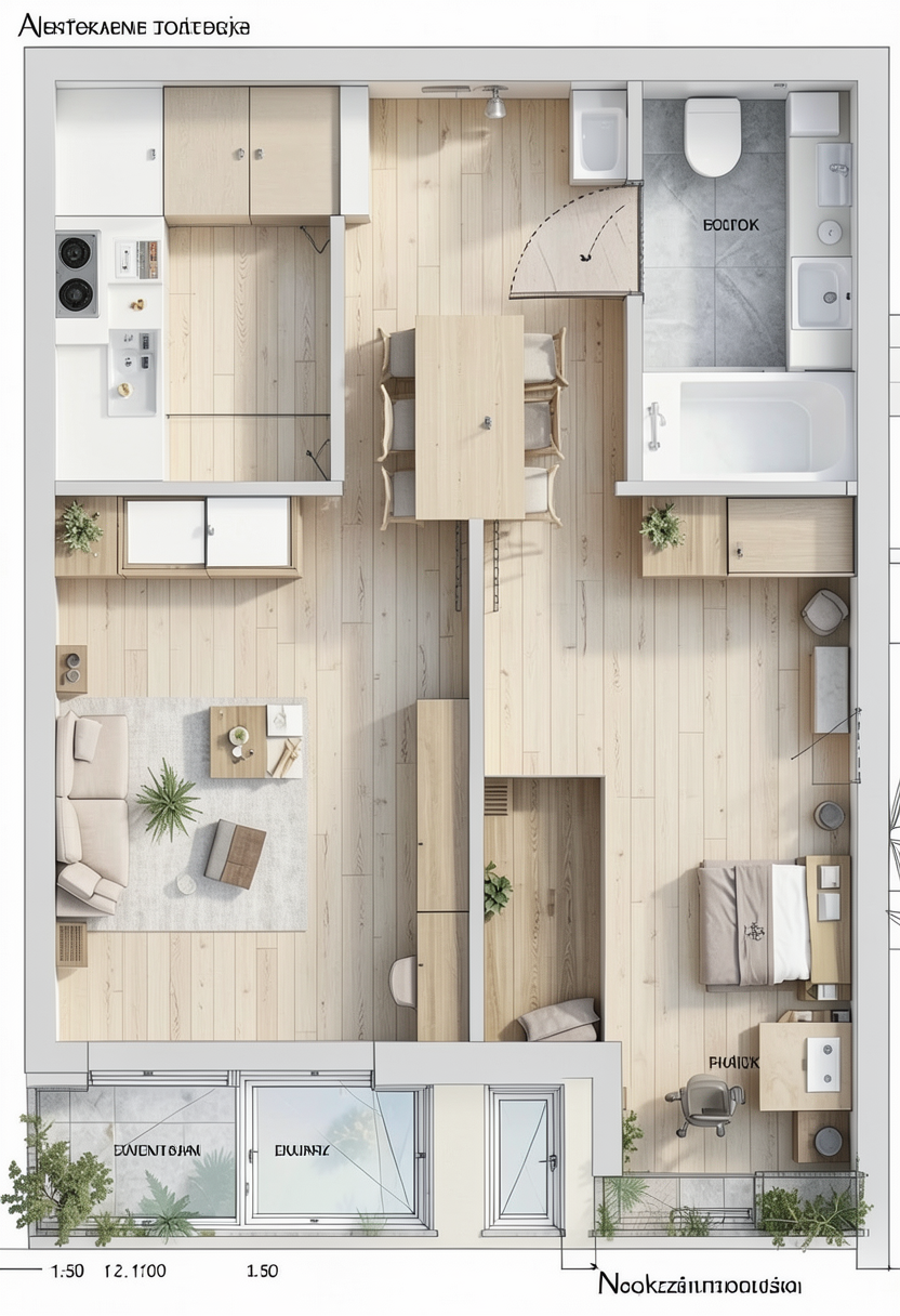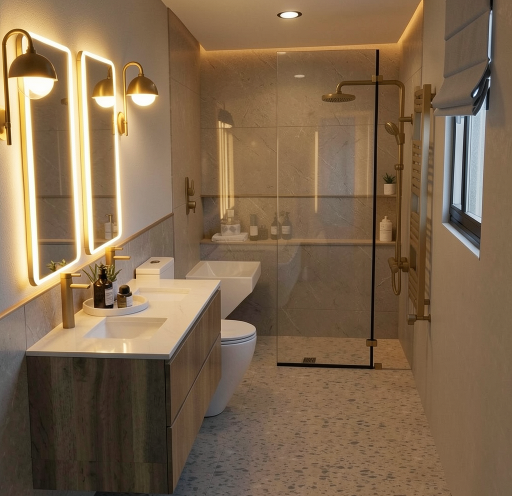 photorealistic render using the provided image as reference industrial minimalist bathroom corridor with exposed concrete walls and ceiling gray brick accent wall on the right and polished concrete floor preserve original architecture proportions and camera angle do not modify layout or volume materials colors raw concrete surfaces with realistic texture dark gray brick wall on right side seamless gray doors yellow metallic brass accents on frames pipes railings vanity structure and details matte dark fixtures lighting warm yellow led strip lighting along ceiling perimeter and wall edges backlit mirrors on left wall indirect floor level led strip soft warm neutral light 3000 3500k subtle spotlights in ceiling tracks mirrors full height mirror on left backlit rear opening reflective mirror surface details industrial pipes and exposed installations in yellow metal the frame in the back is a mirror make it reflective minimalist concrete vanity with integrated storage clean modern slightly futuristic industrial mood atmosphere quality high realism global illumination ray traced reflections cinematic lighting fast render optimized ultra detailed textures camera keep original framing and perspective no distortion or cropping