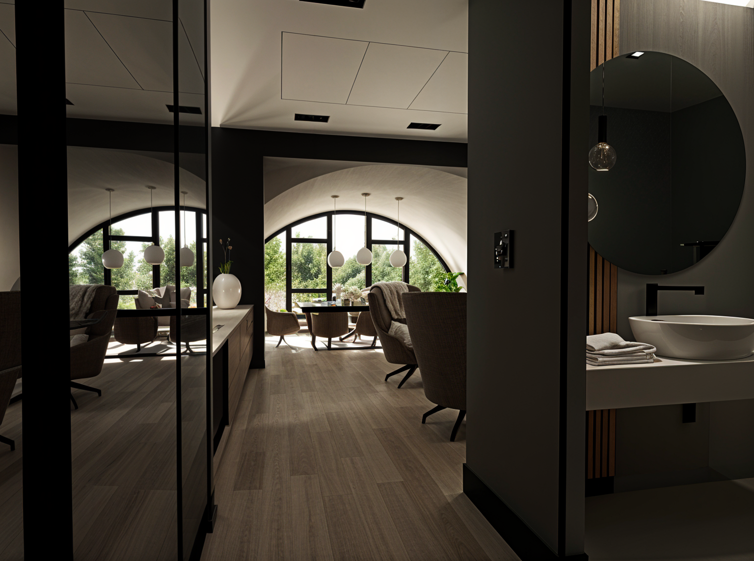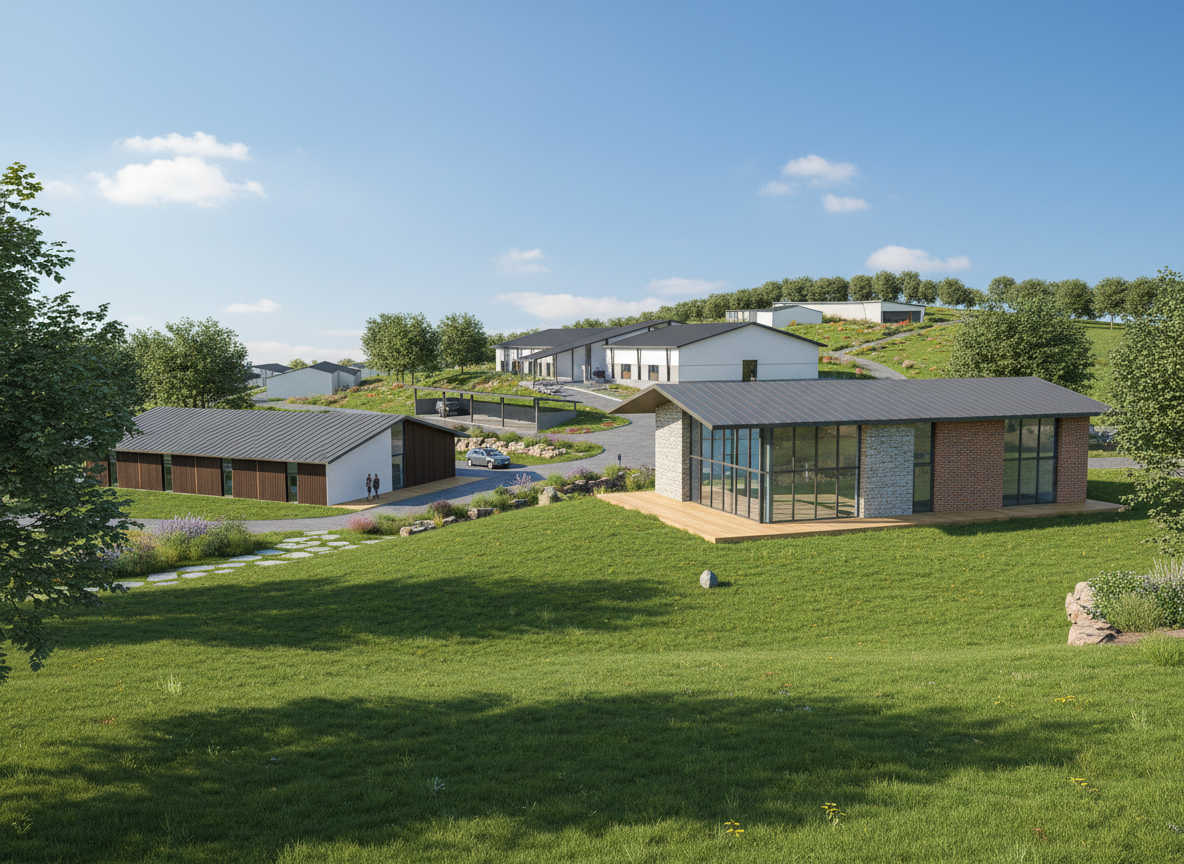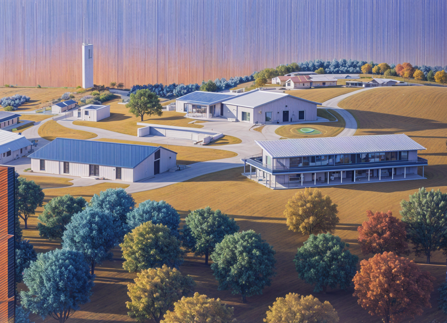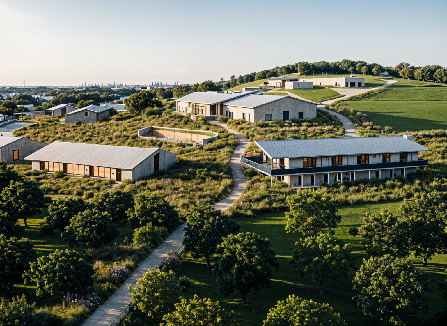 highlight the vegetation and trees the buildings must be made of concrete and the roofs in metal architecture