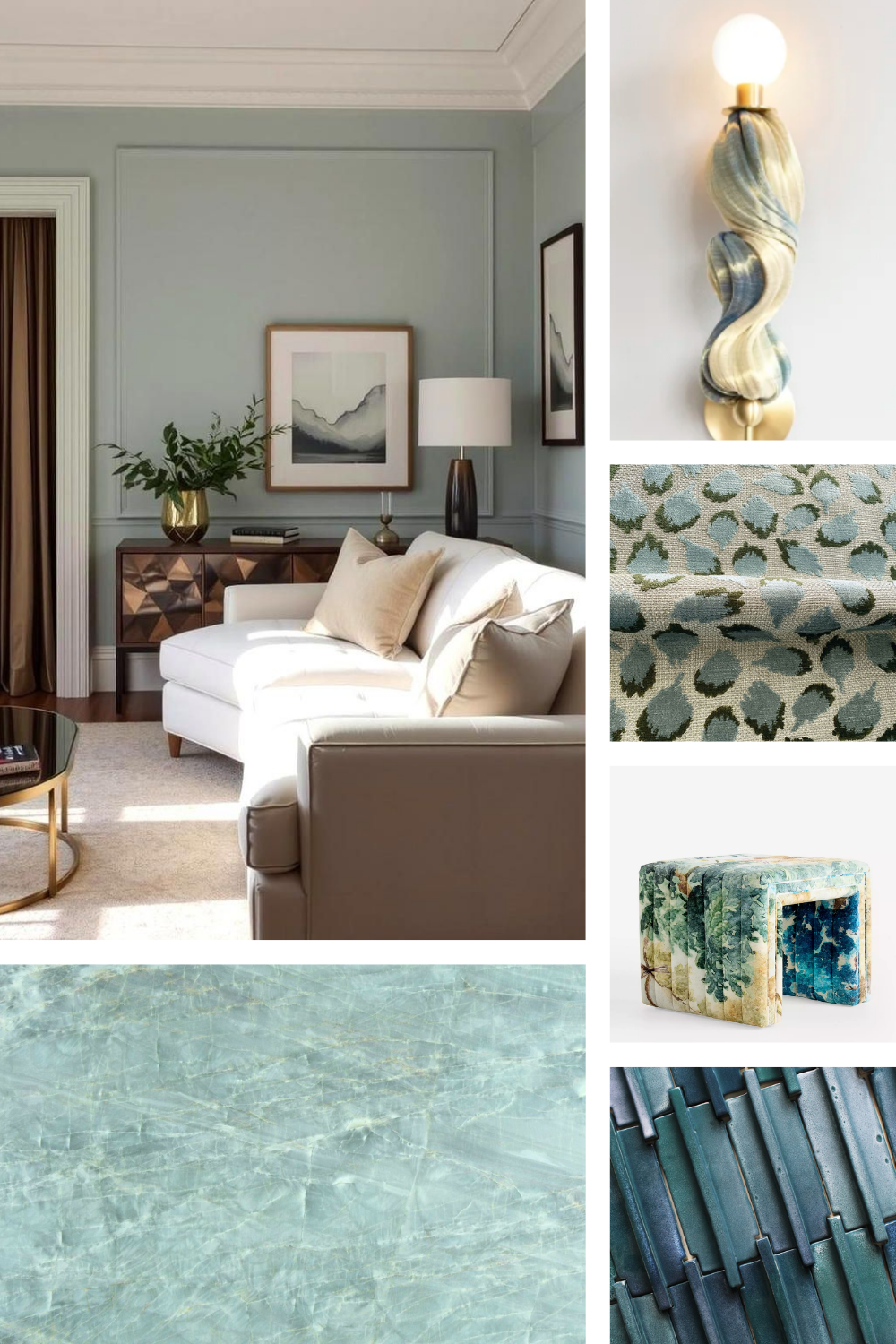 render a high end designer living room from the moodboard featuring a slab of emerald green quartzite as the fireplace show any light fixtures as illuminated and add warm sunlight from nearby windows ensure there are several plants around the space and staged with luxury decor include wallpaper in the architectural elements emerald green quartzite is a light jade green slab with pencil thin veins of white and ocher