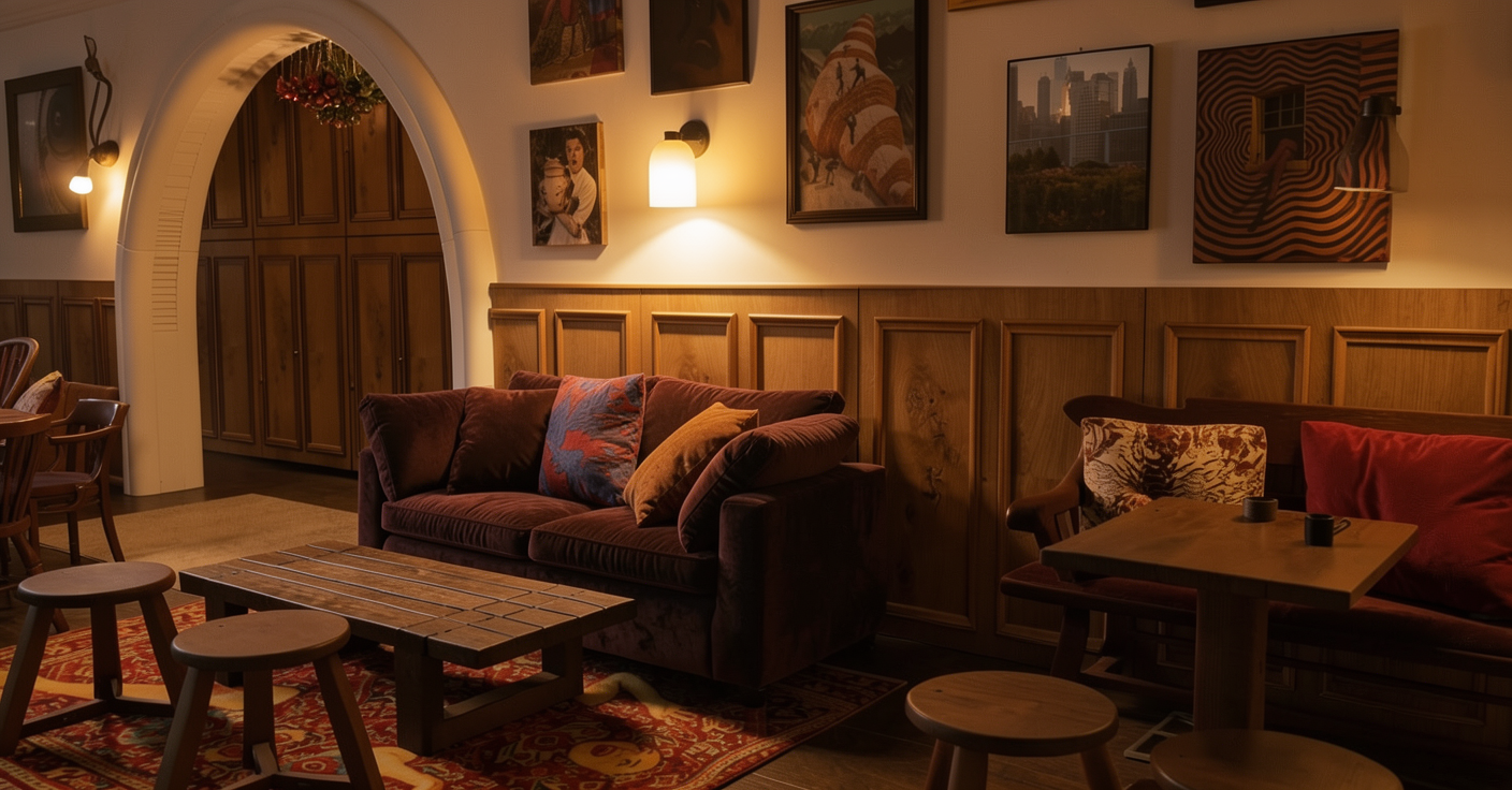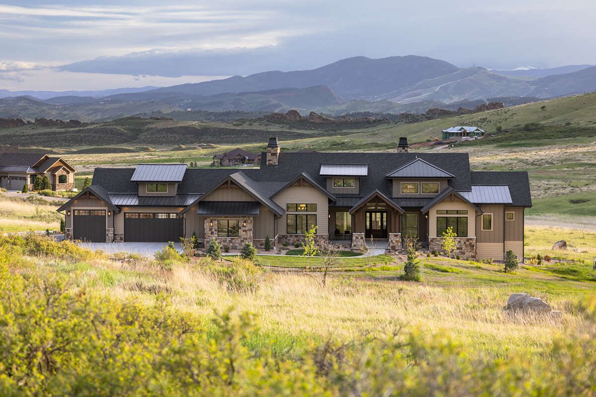 render a stunning modern rustic cabin set on a gentle slope showcasing large glass windows and warm wooden beams enhance the architectural details with a natural stone base in earthy tones illuminate the interior with soft golden lighting to create a cozy inviting glow surround the cabin with lush greenery and spruce trees in varying shades of green set against a cloudy twilight sky with hints of blue and gray to evoke a serene tranquil atmosphere morning light with birds