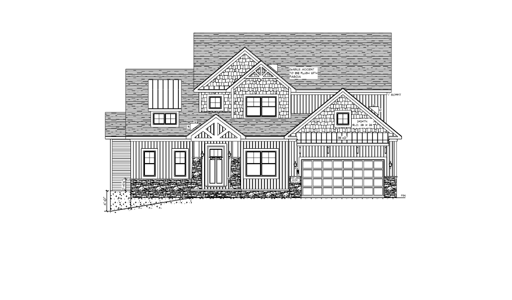 make as photorealistic as possible while keeping textures the same as selection professional landscaping in a lightly wooded scene with good lighting match materials to plan and remove any text light grey siding white trim windows wood grain frontdoor per plan solid garage door with no windows