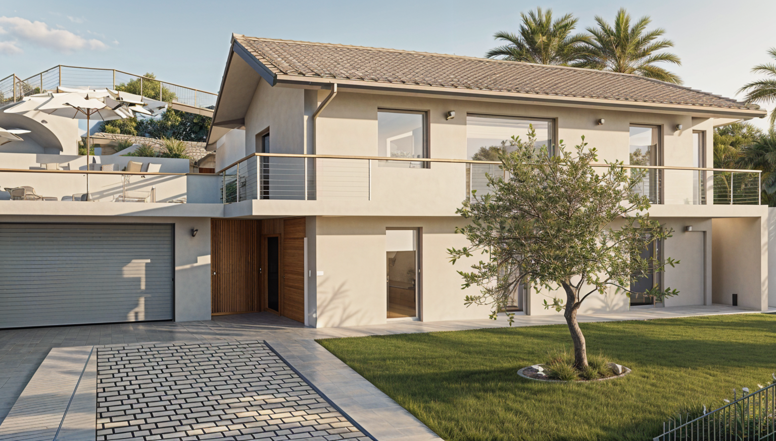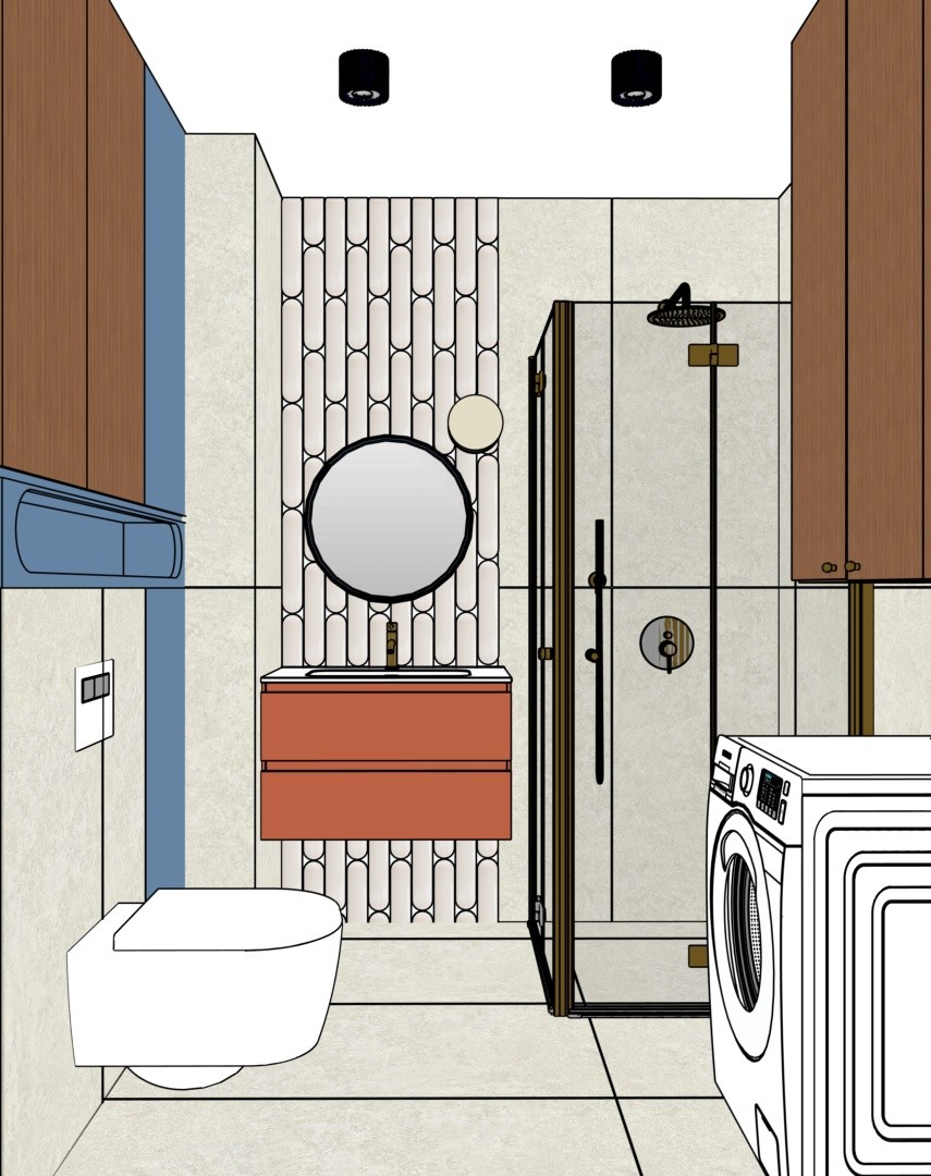 create a modern bathroom by pairing earthy brown wood cabinets with soft cream walls choose a bold accent wall with overlapping white tiles creating a sophisticated pattern behind a round cobalt mirror add an elegant glass shower enclosure with brass accents add a vibrant coral vanity beneath the mirror contrasting with a dark blue side cabinet place a modern white toilet and laundry machine on the left side maintaining a clean and minimalist feel brighten the space with two cobalt ceiling lights with grooves to create a warm and welcoming atmosphere add bathroom accessories that create a cozy atmosphere
