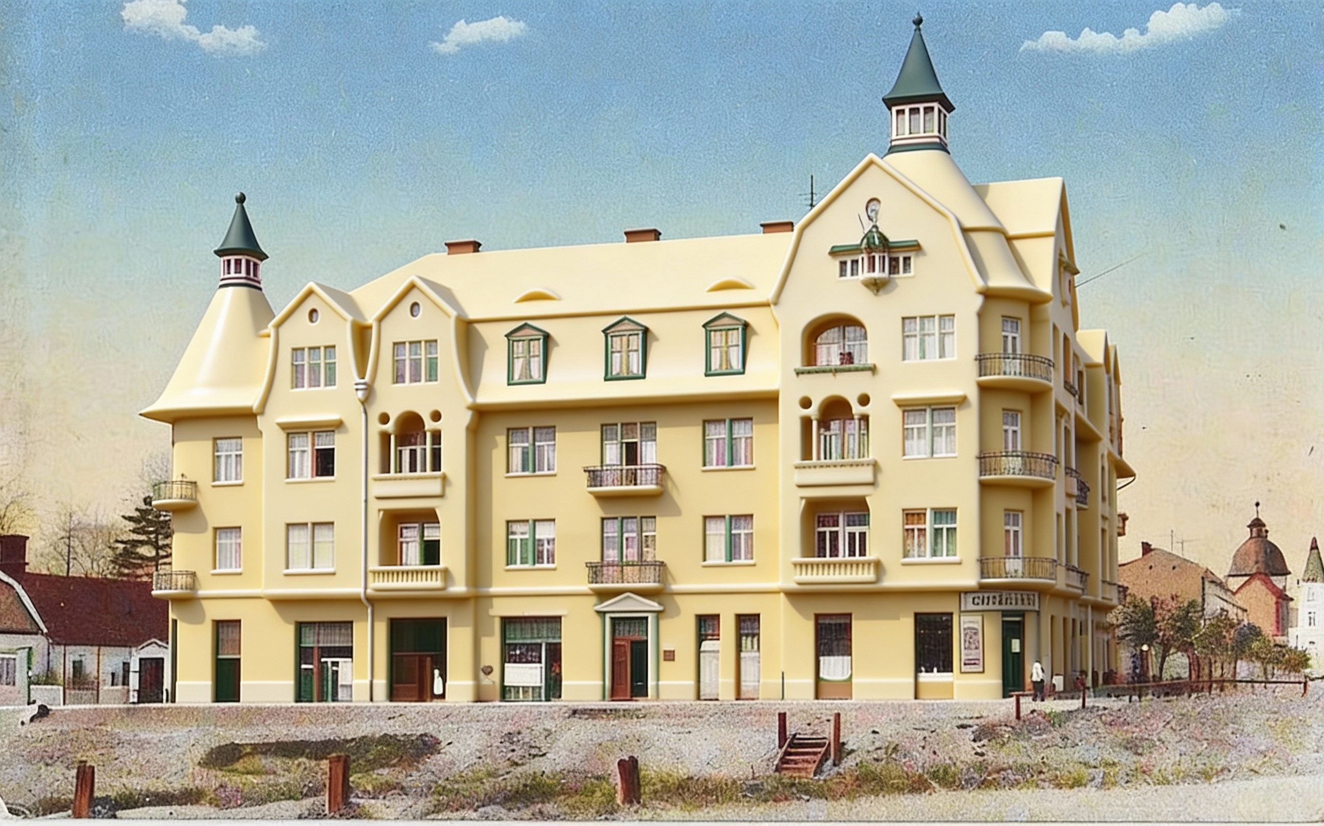 remove text from the bottom of the picture turn dark red facade into light ochre color dark green windows and door frames keep roof color