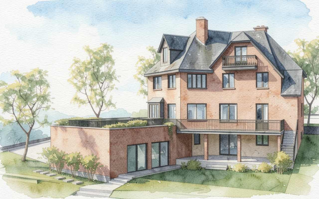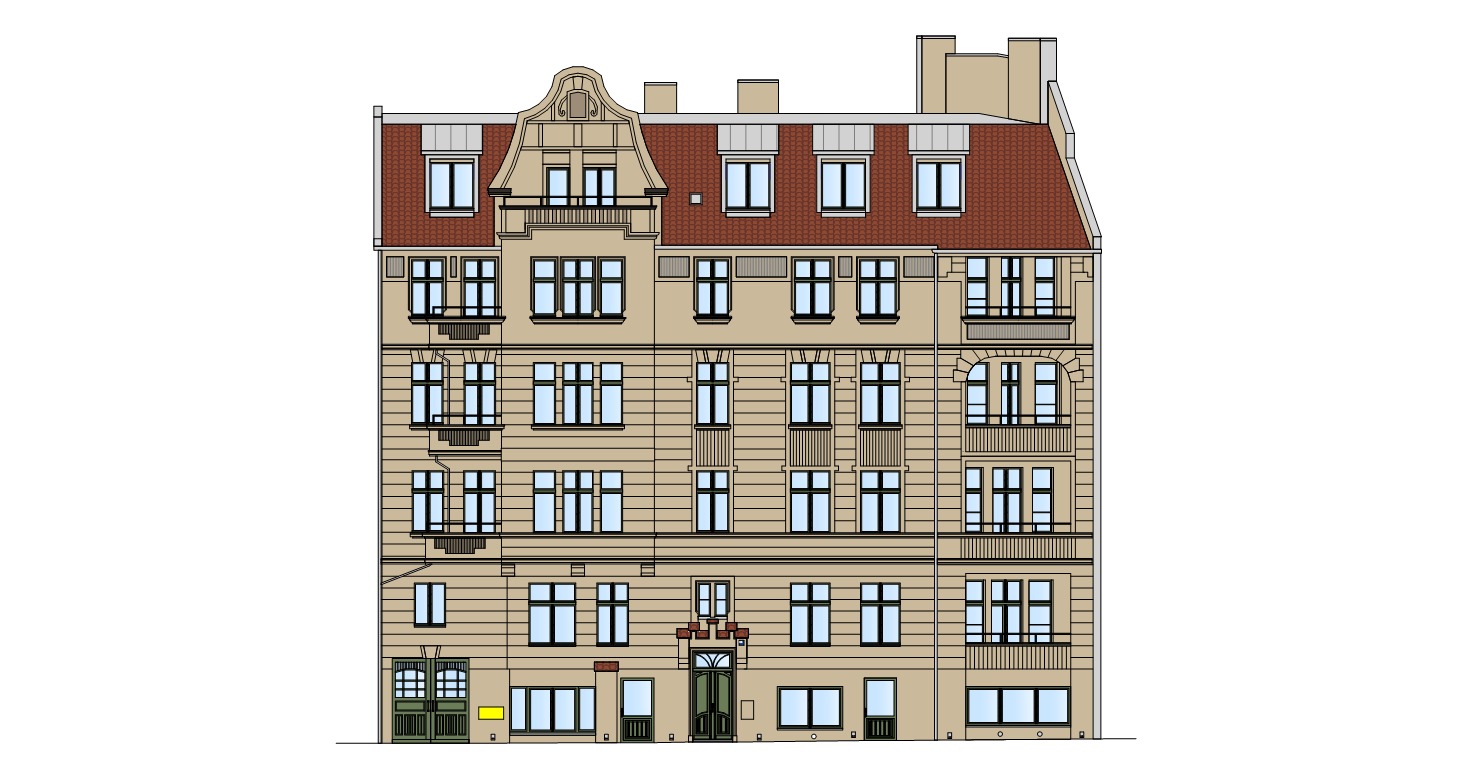be true to original colors renovated elevation of an old building facade is keim s109 doors and windows wood painted in ral 6011 door handles are brass balconies are solid not see through do not add any surroundings just sidewalk and one small tree in front ot the building all the flashings are in natural color