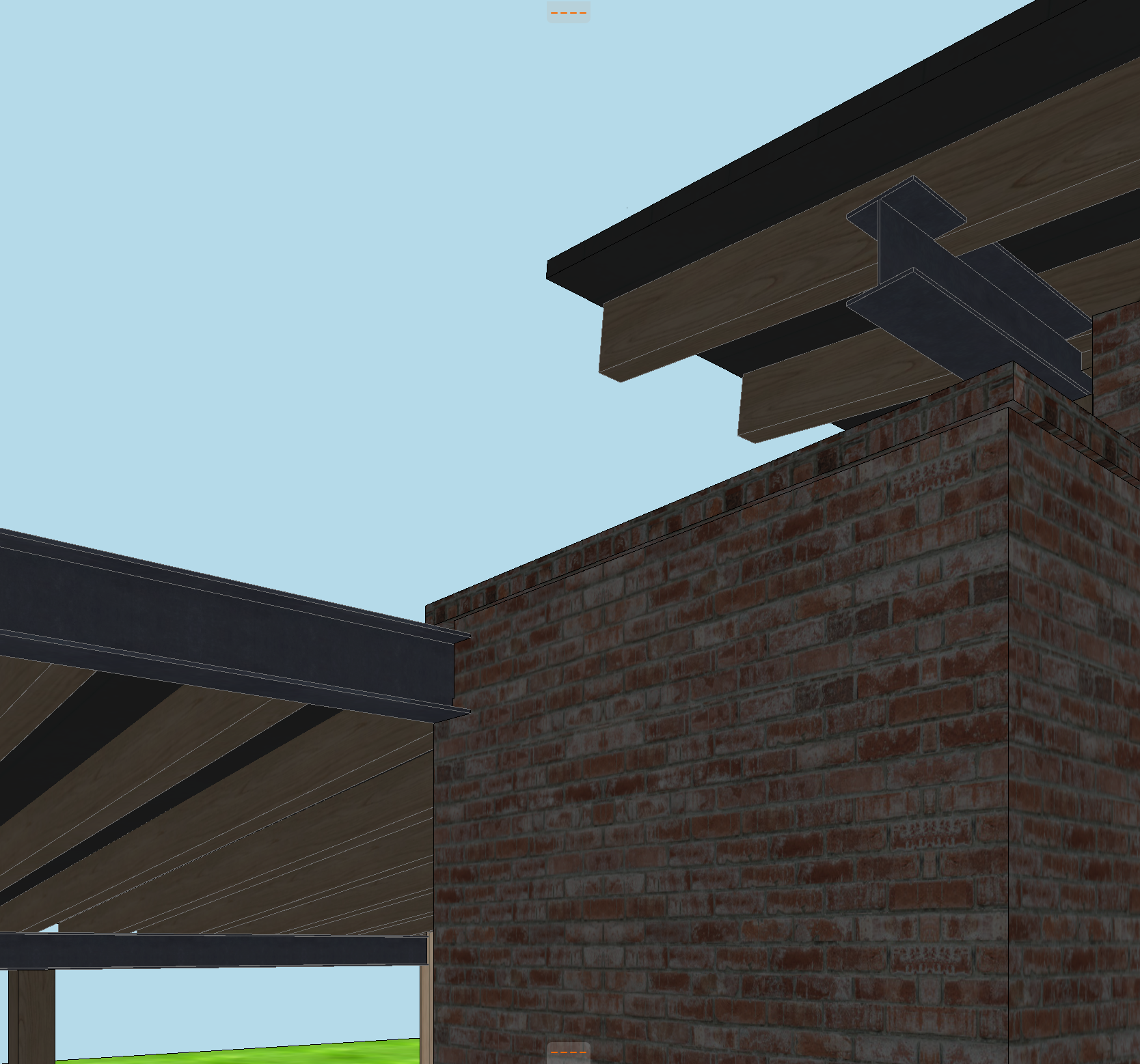 detail shot of an antique brick house with a soldier course at the top of brick walls with timber columns steel beams reclaimed pine soffit yellow pine trees in the background clouds in the sky