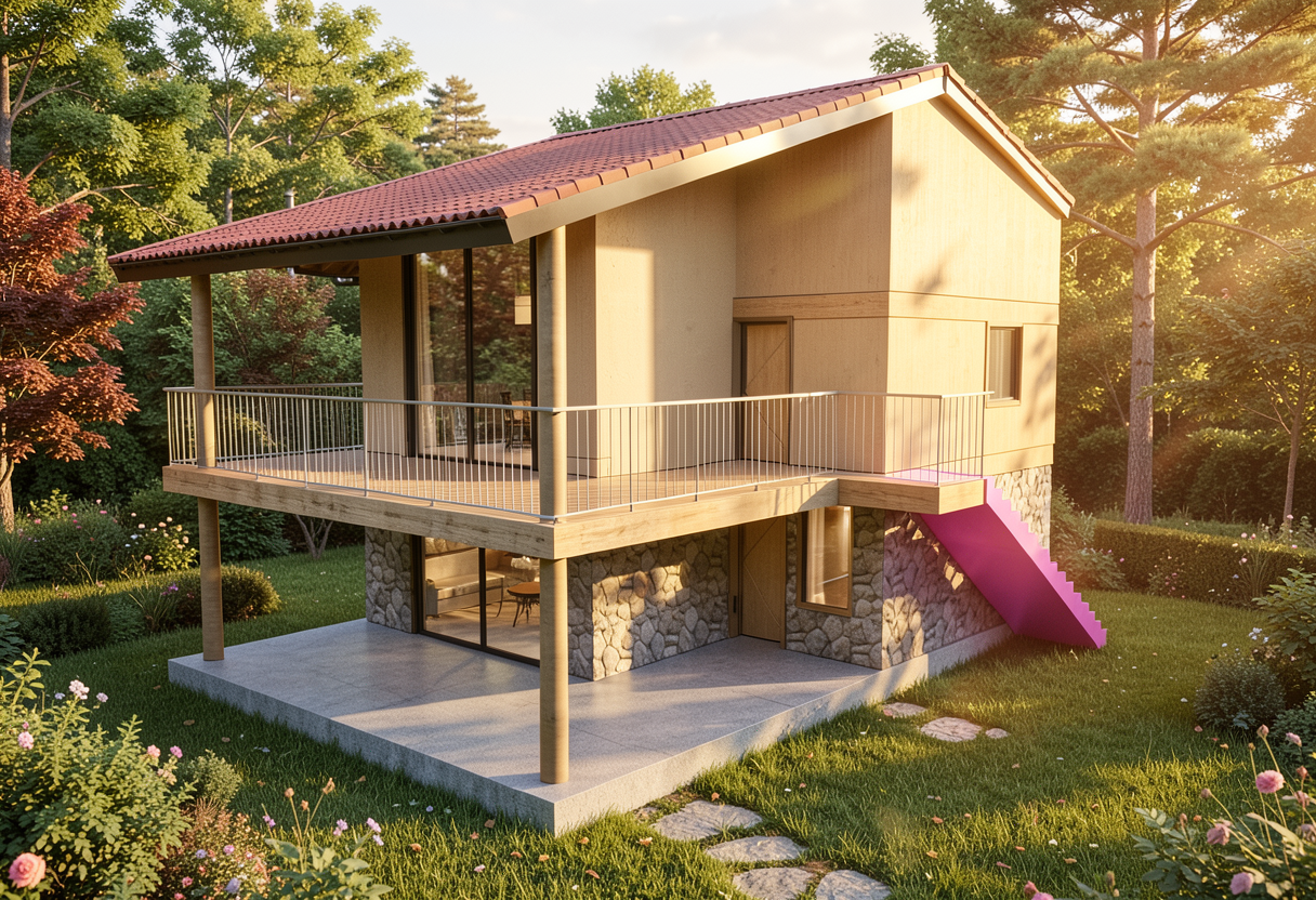 make as photorealistic as possible while keeping textures the same as selection professional landscaping in a lightly wooded scene with good lighting brown roof white trim white windows dark tan siding