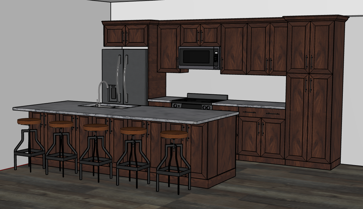this is a beautiful kitchen with cabinets made of natural stained walnut the handles are all a matt black all appliances are a modern stainless steel the countertops are a beautiful white marble the flooring is a nice modern medium light rustic lvp flooring this kitchen has lots of natural light coming in from behind the camera the cabinets go up to a soffit in the ceiling that drops down about 14in and extends off the wall about 15in the peninsula buts right up to the wall on the left