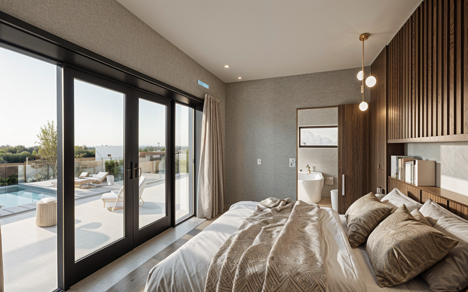 remove tile mosaic from everything except the bottom pieces of the architecture use black steel for structural elements add realism replace buildings on side with something realistic rather than just block walls add cars add people walking on sidewalk add background with sky and clouds