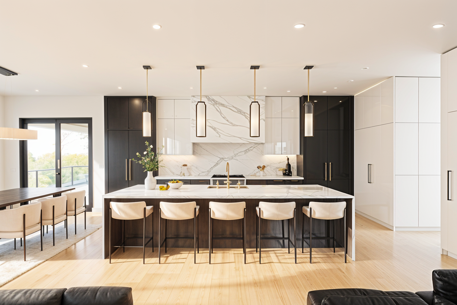 a modern suburban house with a white exterior and dark window shutters the roof is a deep charcoal gray contrasting with the soft cream colored walls the front door is a rich mahogany with glass panels exuding a welcoming atmosphere the driveway is a warm beige leading to a well manicured lush green lawn the sky is clear with a few fluffy clouds painted in light blue and soft white creating a serene and peaceful morning atmosphere