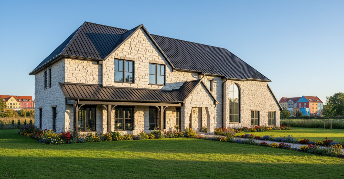 barndominium exterior shot white stone exterior black roof architecture