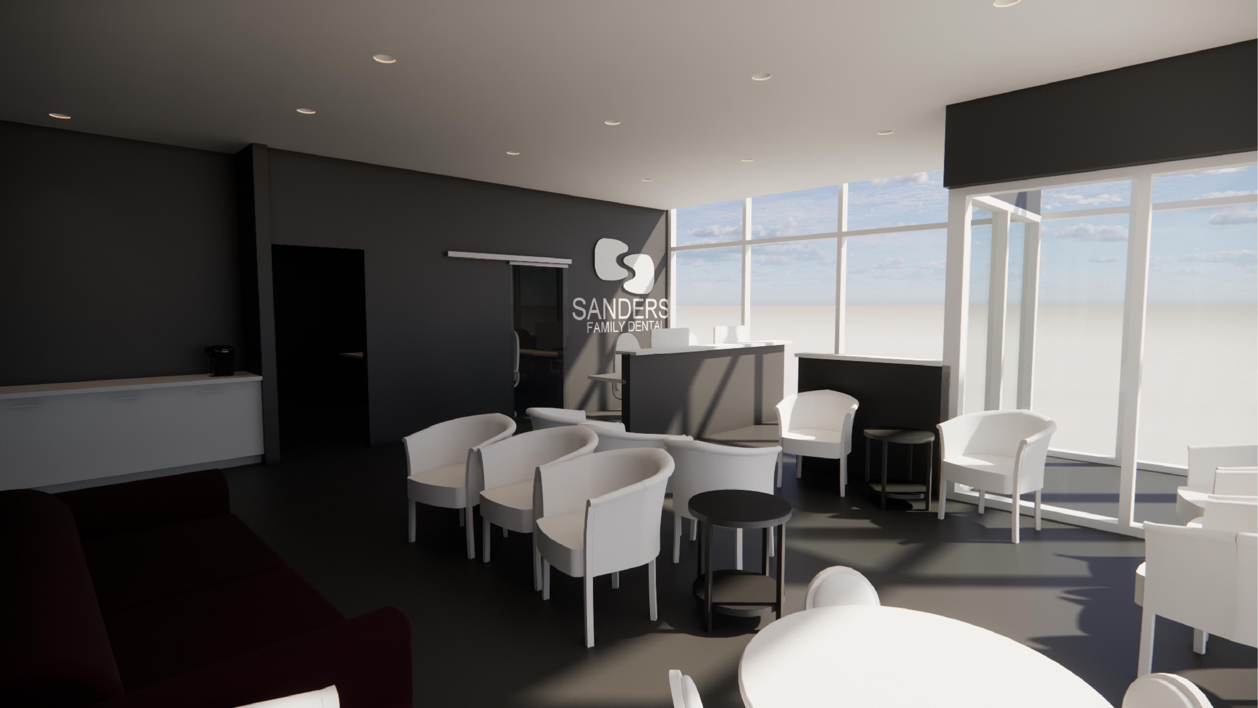 a modern elegant dental waiting room with large floor to ceiling windows the walls are painted matte charcoal gray providing a sophisticated backdrop sleek white armchairs are arranged around circular tables finished in glossy black the floor is a dark polished gray adding depth to the room large windows let in ample natural light casting soft dynamic shadows and revealing a bright blue sky with wispy clouds overhead lights are recessed and warm contributing to a tranquil and inviting atmosphere architecture