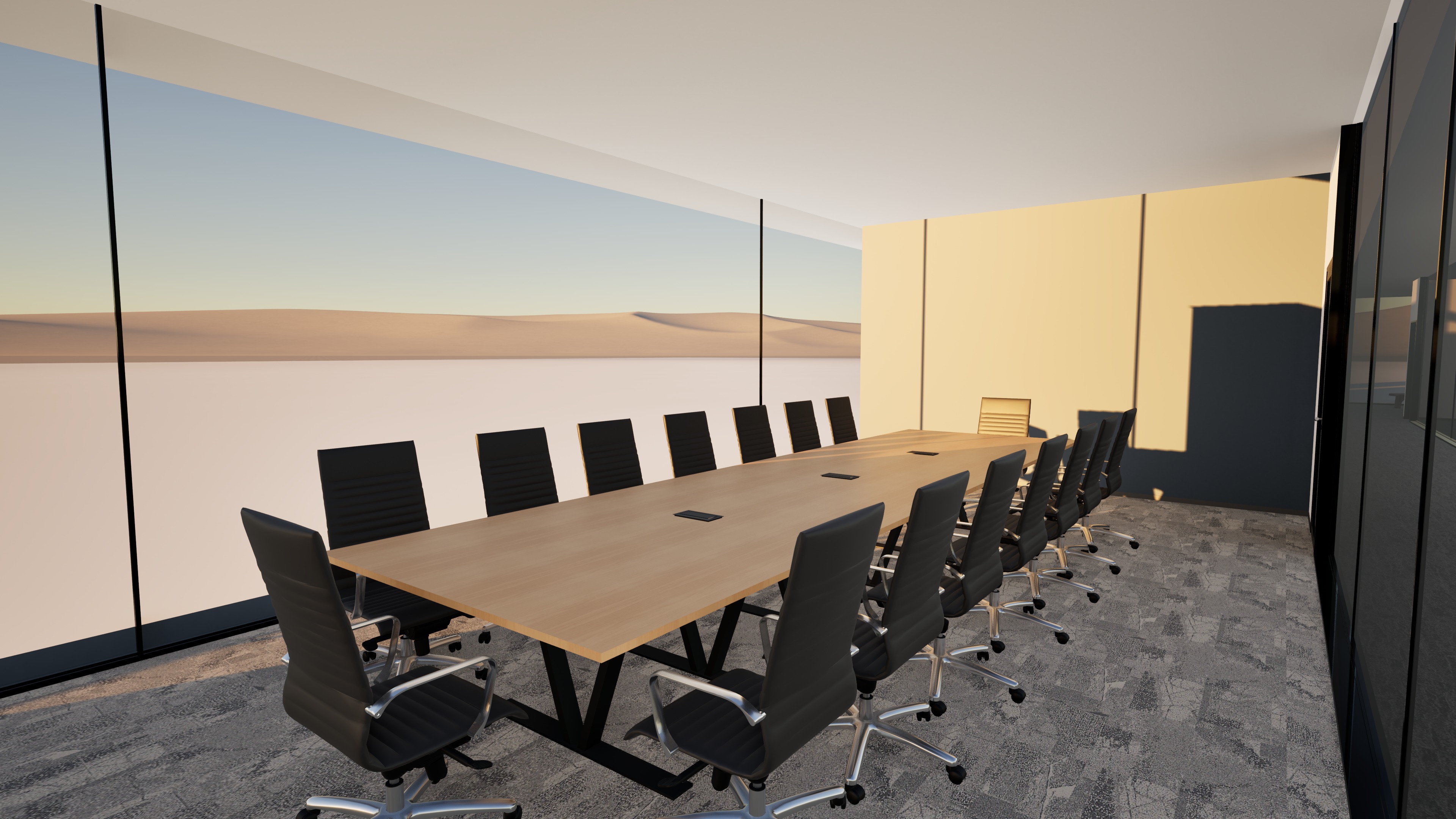 add decor make more realistic add someone sitting at the desk do not change any of the furniture or materials improve the lighting and reduce shadows add a parking lot out of the window view but the room is on the seventh floor add trees around parking lot