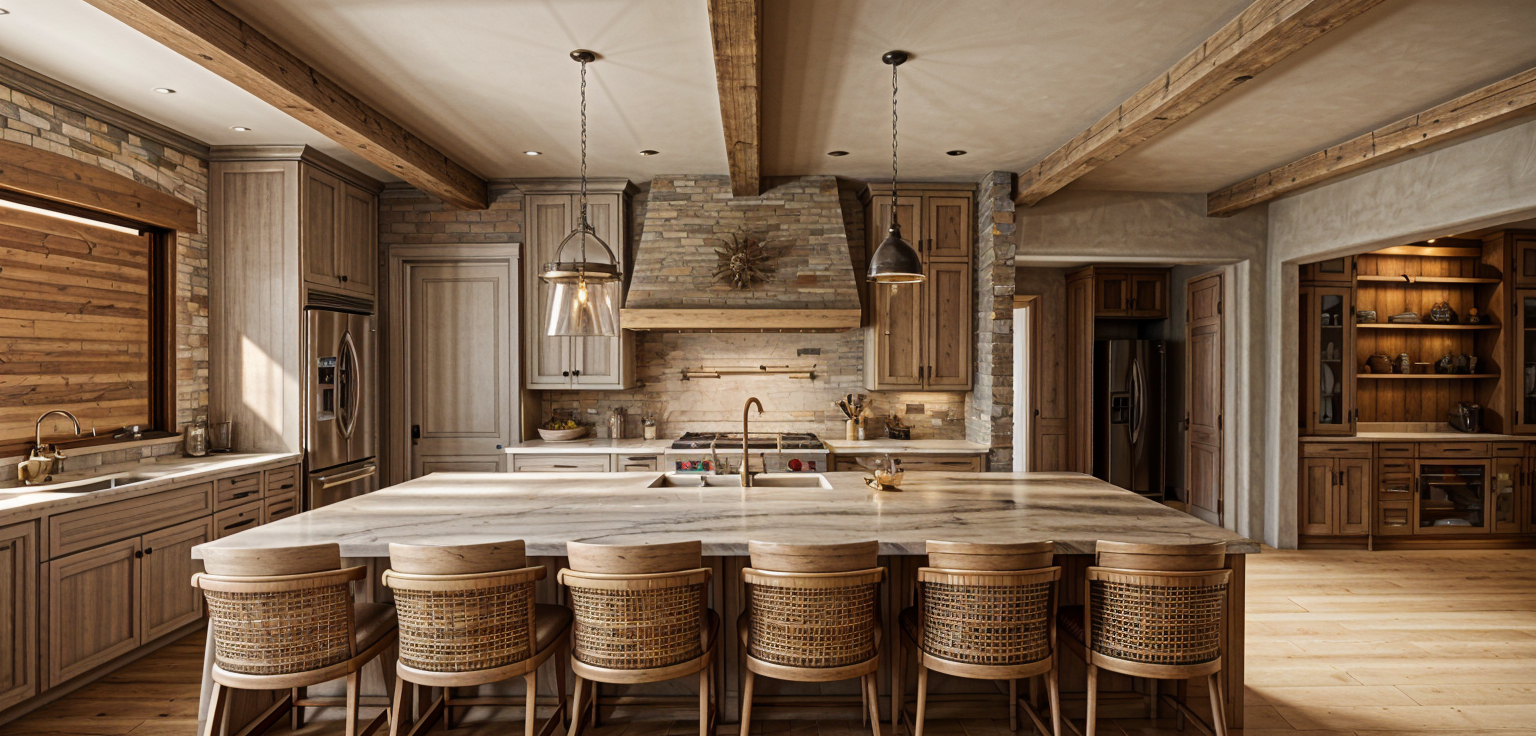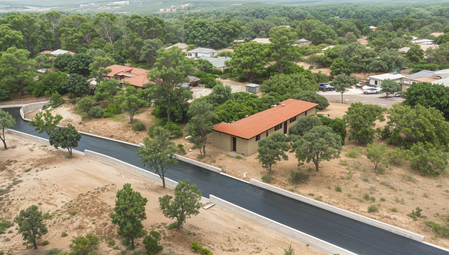 render a serene countryside landscape featuring a vibrant green forest of pine and oak trees the houses blend harmoniously with the surroundings featuring warm toned earthy stucco walls and red clay tile roofs the road is smooth and dark asphalt bordered by natural stone walls in a light gray hue sunlit ambience casts soft golden daylight across the foliage creating an inviting and peaceful atmosphere the distant hills are lush and rolling casting gentle shadows while the sky is a clear blue with a few fluffy white clouds enhancing the tranquil scenic view architecture