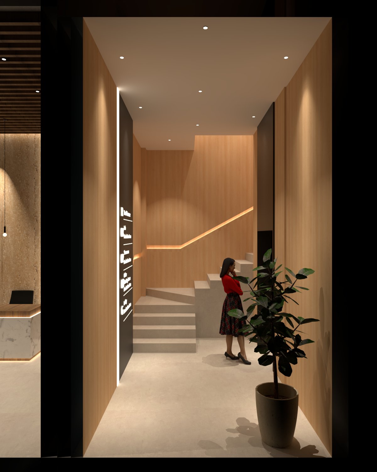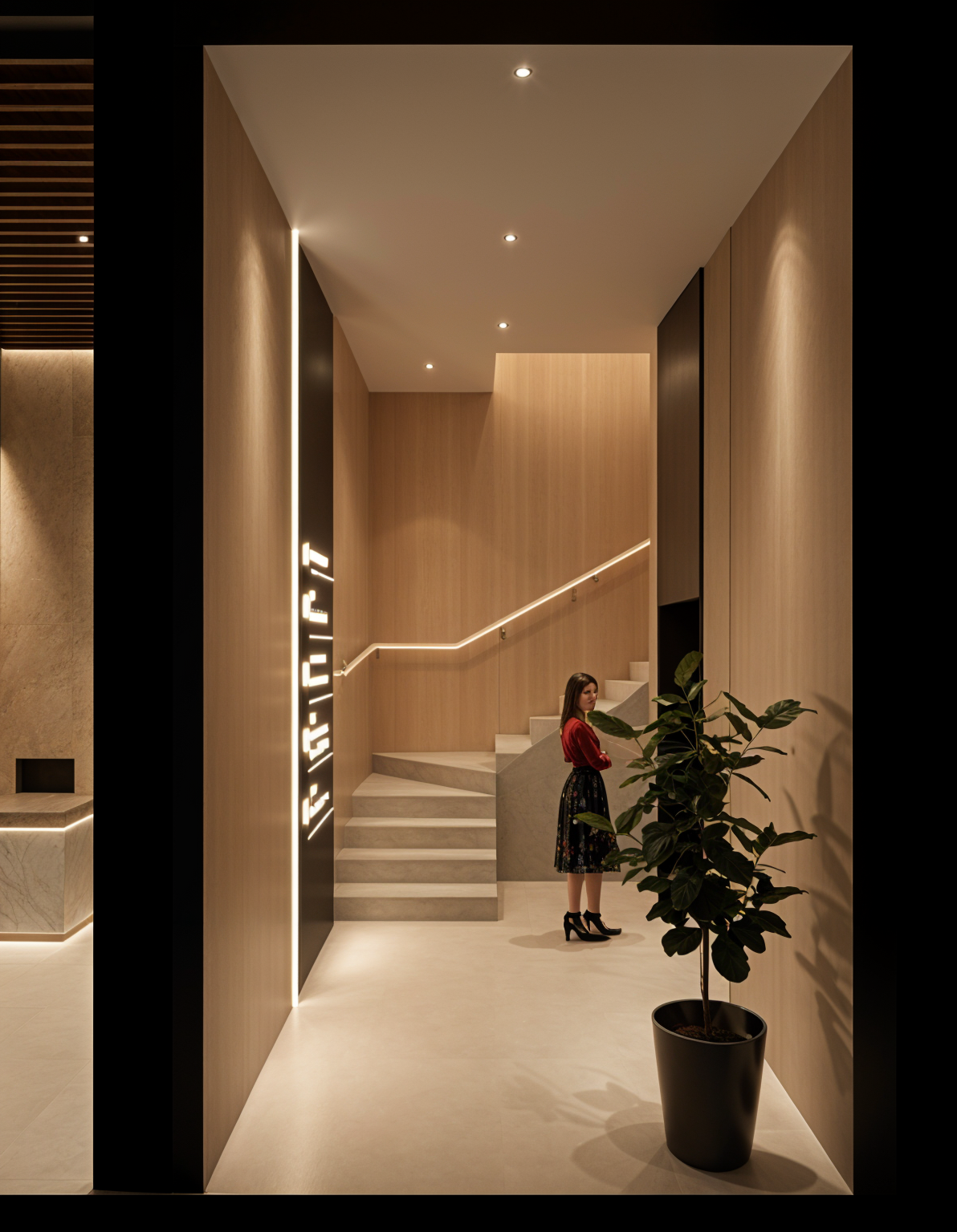 modern interior space with a warm and inviting atmosphere the walls and stairs are clad in light oak wood adding a natural element on the stair wall there is a recess for the stair railing with warm colored lights the ceiling is a soft white with embedded spotlights casting subtle warm glows a sleek black panel on the left wall serves as a signboard accentuated with glow warm white text the flooring is a smooth light grey concrete complementing the overall neutral tones the potted plant with its vibrant green leaves adds a touch of nature against the minimalistic backdrop and the pot has a smooth grey stone texture a person is standing near the stairway wearing a bright red top and a patterned midi skirt introducing a pop of color and human warmth to the scene carefully balance light and shadows for a sophisticated elegant look dont add anything in the wall