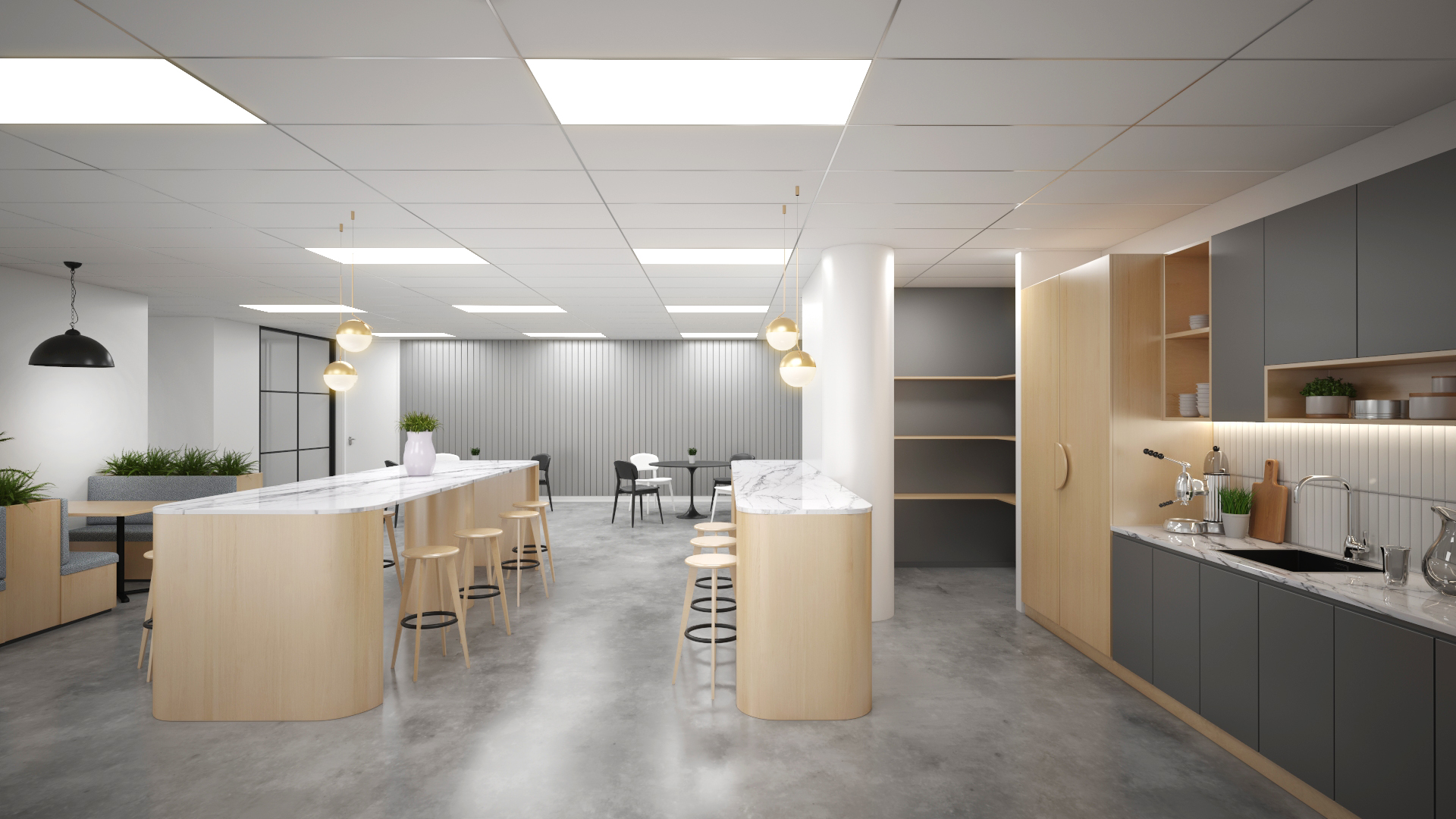 render a modern kitchen with a sleek minimalist design the cabinets should be a smooth soft cream color complementing the warm ambient lighting that creates a cozy and inviting atmosphere the countertops are done in a pale marble with subtle gray veining adding elegance and sophistication include a stainless steel refrigerator and modern appliances in black the floor should be covered with large dark gray tiles that contrast beautifully with the lighter elements add subtle greenery like a small potted plant for a touch of nature the overall atmosphere is clean contemporary and warmly lit with a sense of harmony and balance