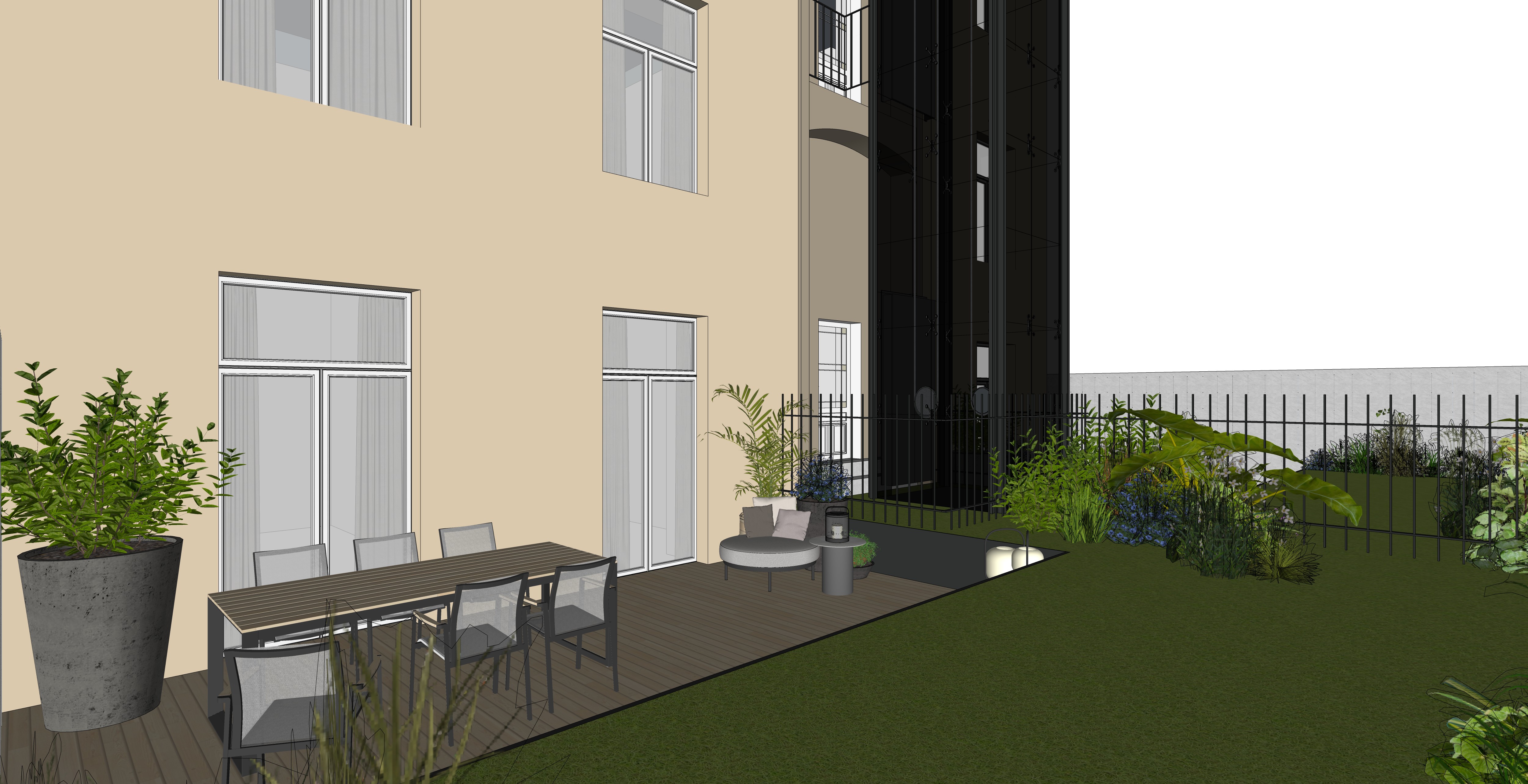 window frames white elevator lining black glass add more greenery and grass
