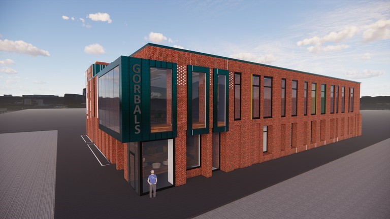 make a realistic render of this model put street details like trees and pedestrians outside the window