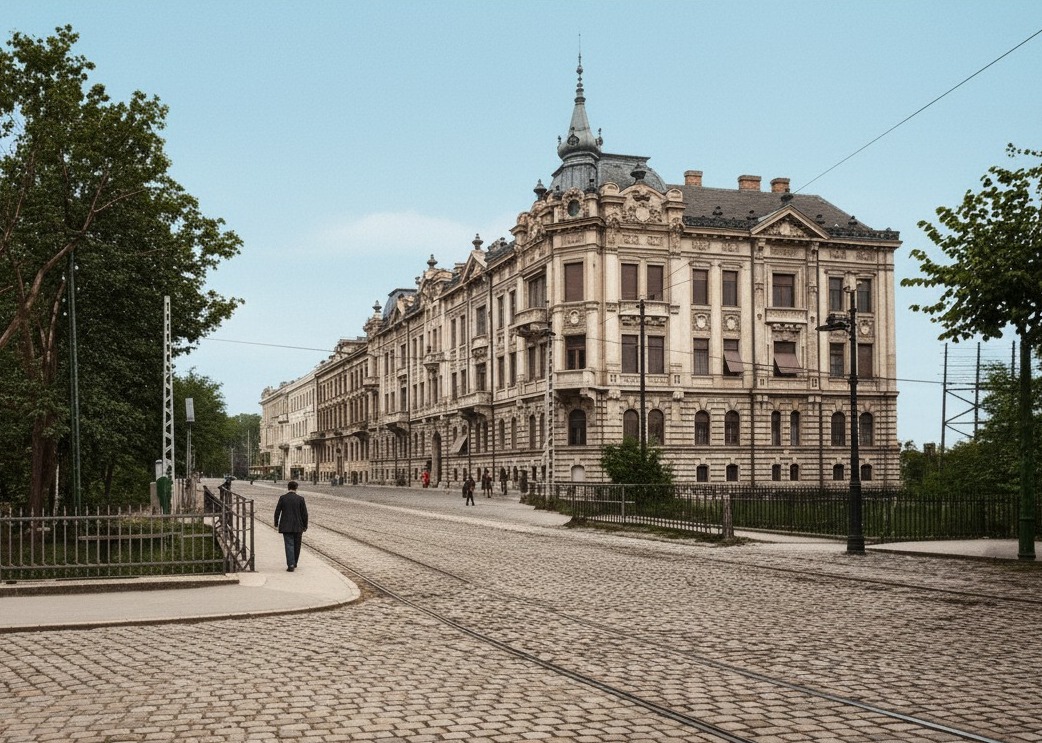 sunny day from east more hyperlight cinematic realistic rendering beautyful clouds 1900 s style dressing people coach cart with horses far away black tram in front of the building remove text from the picture paved road warm color stucco fassades