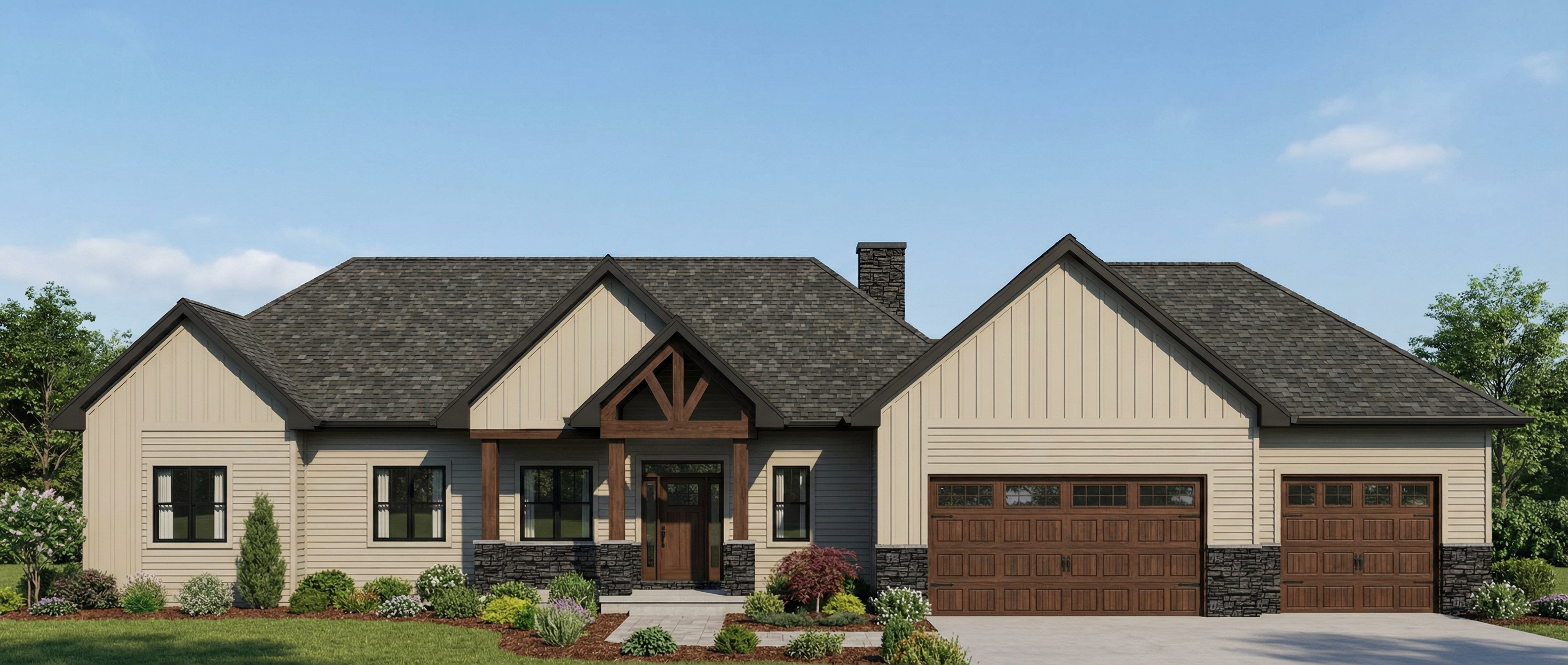 convert this architectural rendering into a highly realistic editorial style luxury outdoor photograph suitable for marketing and listing imagery maintain the exact architecture layout geometry porch structure ceiling design openings and proportions exactly as modeled do not redesign restyle or modify the architecture in any way do not move walls columns windows doors or built in elements enhance realism only through natural lighting accurate material texture subtle reflections and soft shadow depth the final result should feel like a professionally photographed architectural digest style exterior used for luxury real estate marketing materials in the space include tilebar 12x24 black slate tile flooring in a herringbone pattern hardie siding painted sherwin williams pure white roof standing seam charcoal metal with no slope flat roof soffits and fascia painted sherwin williams origami white gutters and downspouts in charcoal finish fluted wood ceiling cladding the black slate tile should appear natural matte and slightly textured with subtle tonal variation and realistic grout lines the herringbone pattern should read clearly with correct scale and alignment the roof shingles should appear textured and dimensional with natural variation consistent with charcoal architectural shingles the soffits and fascia in origami white should appear soft and clean with subtle tonal depth the gutters and downspouts should appear matte charcoal with realistic metal finish and clean edges the fluted wood ceiling should show realistic wood grain depth and shadow between flutes with a warm natural tone do not add or modify any furniture if furniture is present keep it minimal and secondary to the architecture without adding new elements the outdoor space should feel elevated calm and refined with a strong connection between the porch and yard lighting should include soft natural daylight with gentle exterior shadows and realistic light falloff the lighting should feel balanced and editorial not harsh or overly dramatic the final image should appear crisp photorealistic and editorial similar to a professionally photographed luxury exterior avoid warped or exaggerated wide angle distortion the perspective should feel natural as if captured by a professional architectural photographer with straight vertical lines and balanced proportions do not alter architecture layout geometry or materials only enhance realism the yard is mostly grass the only part with the slate look floor tile is under the porch itself