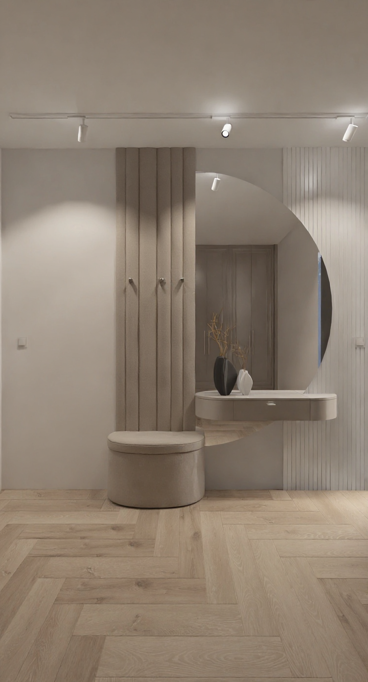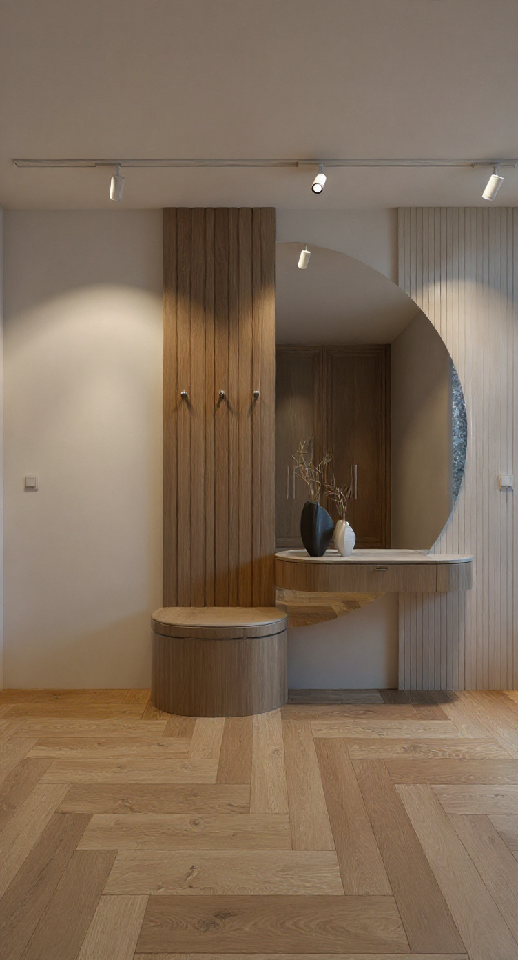 interior shot please create a soft light scandinavian atmosphere the kitchen is matte white the countertop and backsplash are natural oak the floor is also natural oak the wall is rosemary branch color the curtains are white the blackout is beige the sofa is pale beige the entire tv cabinet on the wall is uniformly medium brown wood with closed doors