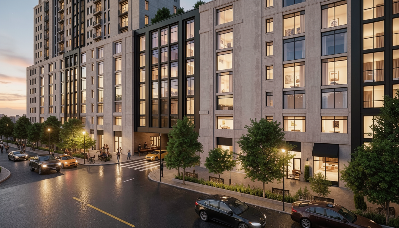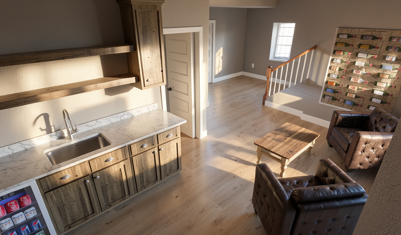 ender a modern kitchen and living space with a warm and inviting atmosphere use a soft white color for the walls and a rich white oak tone for the hardwood floors the kitchen cabinets should be a moody charcoal gray with sleek brass handles and the island should have a marble countertop with waterfall mitered edges and a subtle gray veining the backsplash in the kitchen will be the same marble as the countertop add a light rattan sideboard with a display of elegant liquor bottles and artwork above featuring soft abstract designs in beige and dark olive tones the ceiling is a light taupe to complement the walls emphasize natural lighting coming through large windows creating a cozy sophisticated ambiance the fireplace will be a modern stucco finish to compliment the area add a framed tv over the fireplace add 4 complimentary barstools at the island overhang