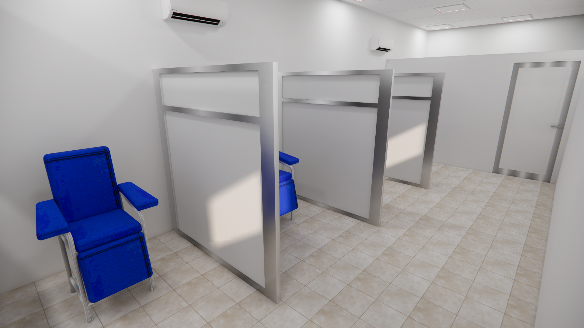 a clean modern blood drawing clinic and laboratory interior with individual patient cubicles white walls with slightly warm tone stainless steel trims and soft matte finishes each cubicle contains a medical phlebotomy chair with armrest small mobile tray with blood collection tubes needles gloves and labeled containers add subtle medical clutter sharps disposal boxes yellow alcohol swabs cotton pads and tourniquets flooring in light beige ceramic tiles with slight wear and realistic grout ceiling with recessed led panel lights emitting soft neutral white light 4000k slight variation in brightness wall mounted split ac units with realistic shadows and slight discoloration from use add human touch a few patients seated one nurse preparing a blood draw wearing gloves and mask another cubicle partially occupied include small details like wall signage lab instructions hygiene posters a digital queue screen and faint reflections on metal surfaces lighting should be soft and natural with subtle shadows slightly imperfect for realism camera perspective at eye level slight depth of field realistic ambient occlusion overall mood sterile but active professional healthcare environment not overly perfect