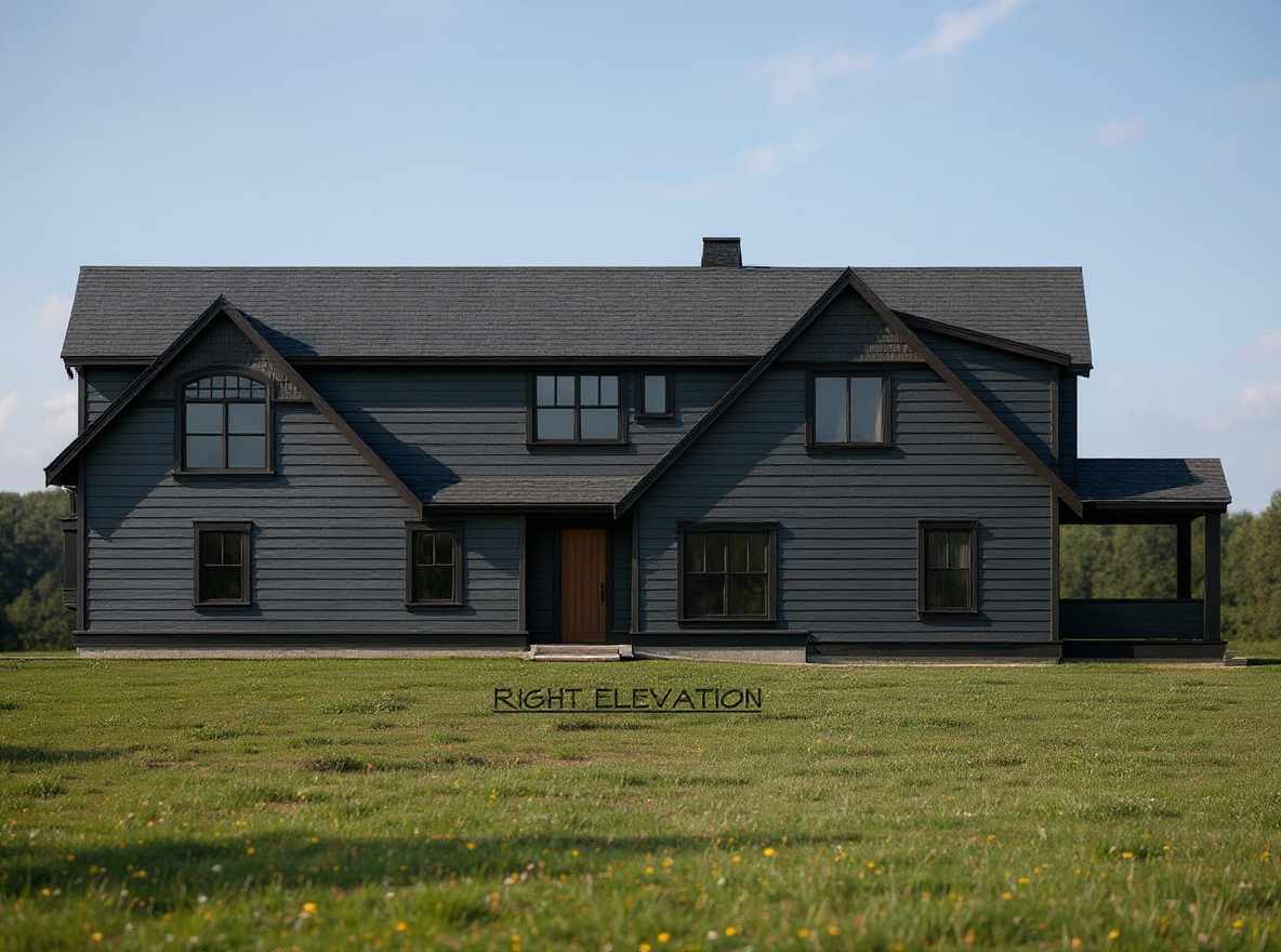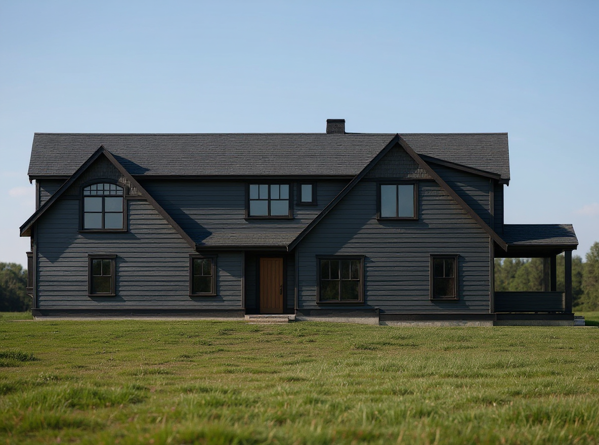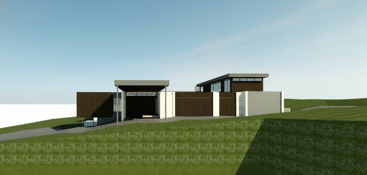 do not crop show full extent of house do not change massing and design render rammed earth walls dark timber cladding dark grey parapet walls and roof