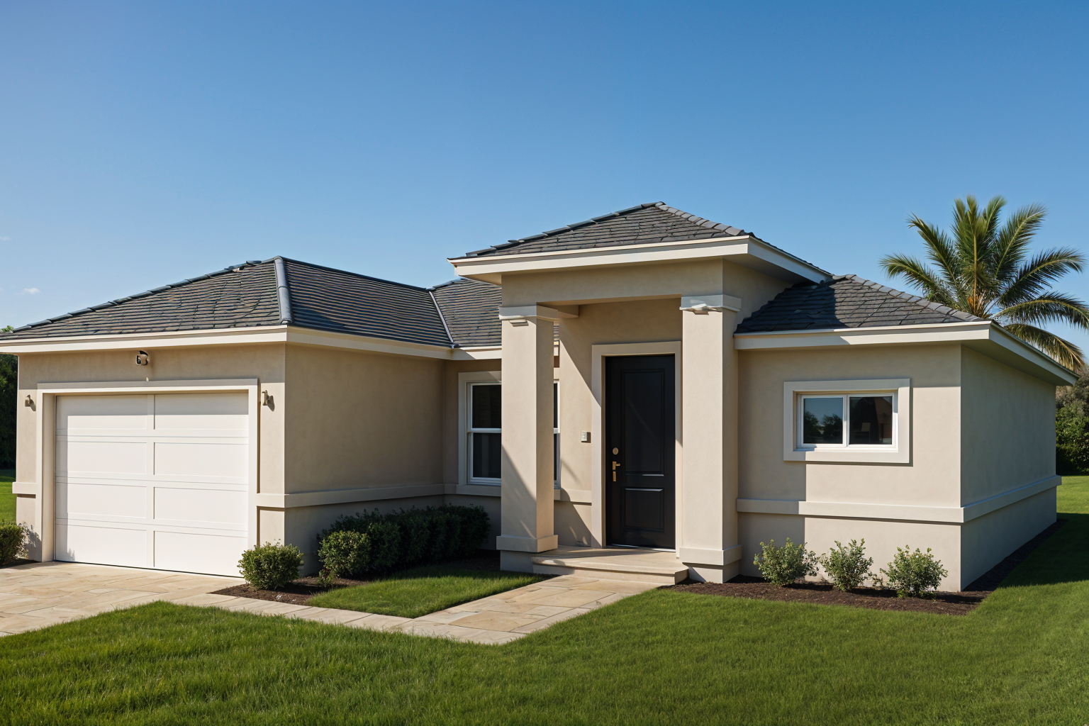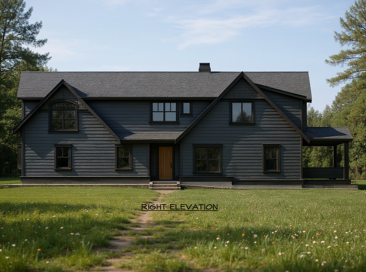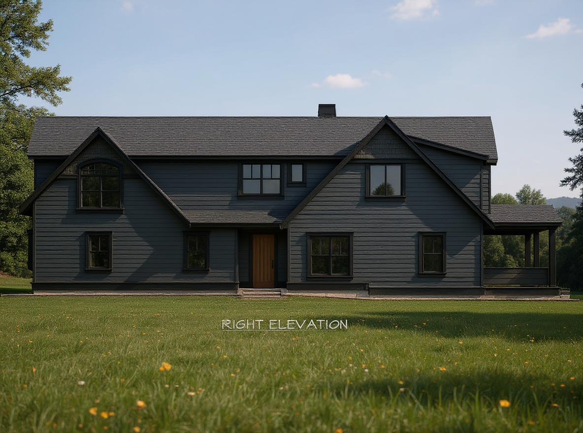 do not crop show full extent of house do not change massing and design render rammed earth walls dark timber cladding dark grey parapet walls and roof