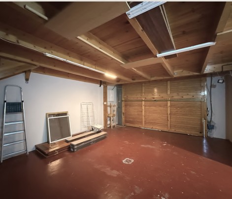 armarios blancos con puertas lisas que ocupen toda la pared del fondo solo una ventana que quede a 40 cms del suelo parquet roble color avellana claro