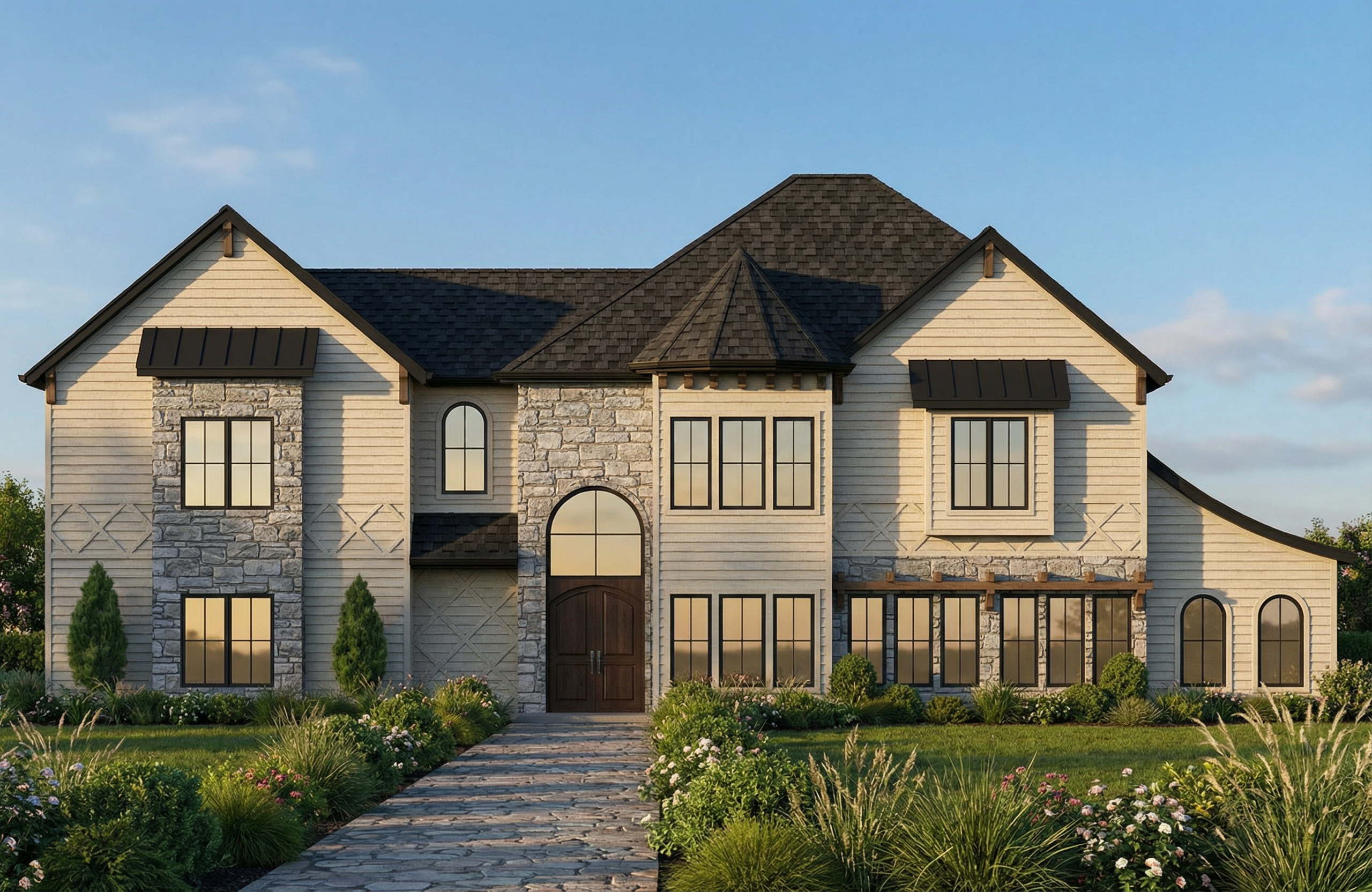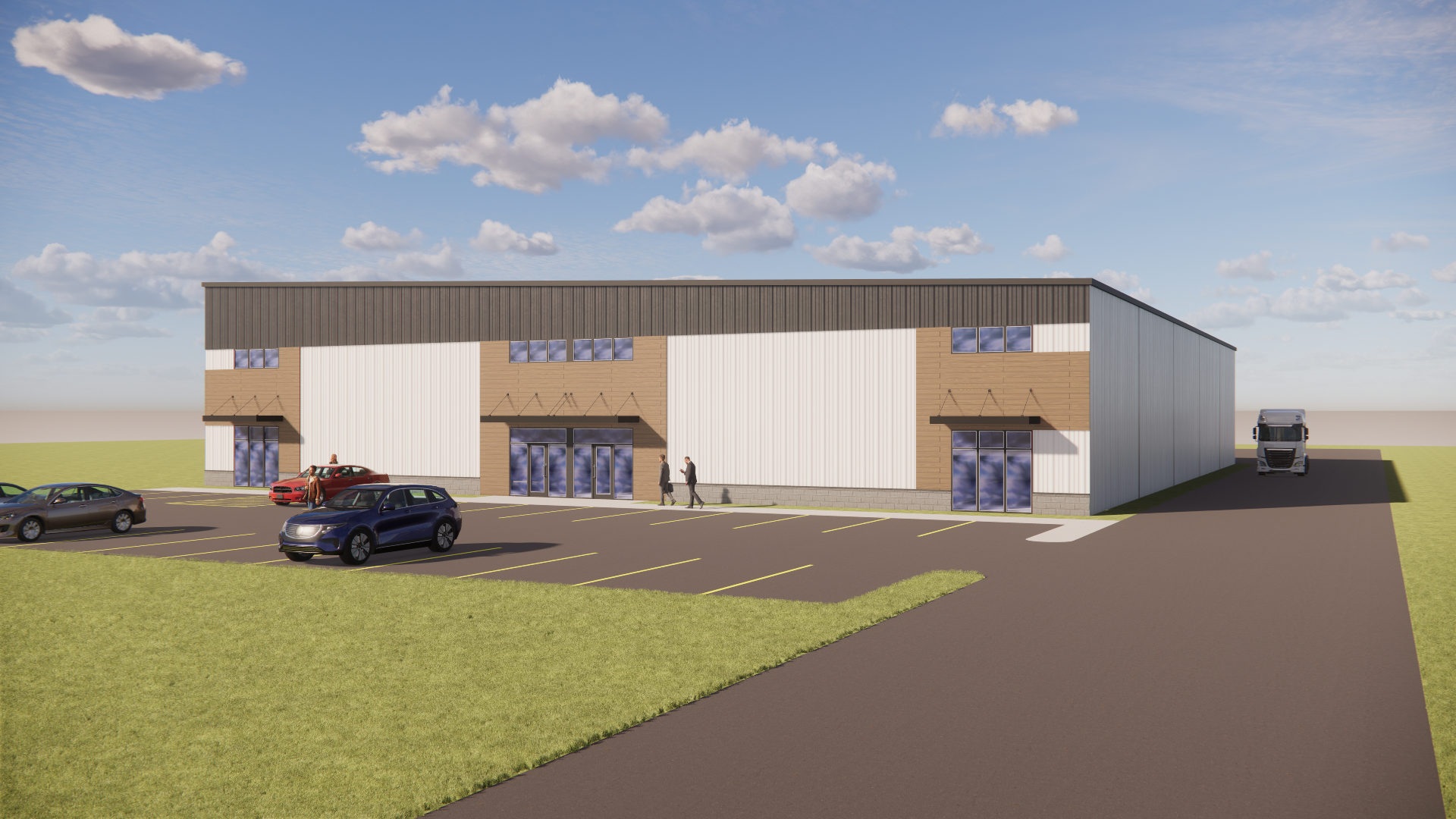 modern facility with metal siding light grey steel siding as shown with a black steel band at the top steel black flat awnings over doors and windows where shown 8 horizontal wood paneling where shown grass lawn with an asphalt parking lot with cars and people as shown asphalt driveway extending to the back of the building keep everything as shown don t change doors windows siding colors etc show some smaller buildings in the far distance with a few trees surrounding the building on a sunny day