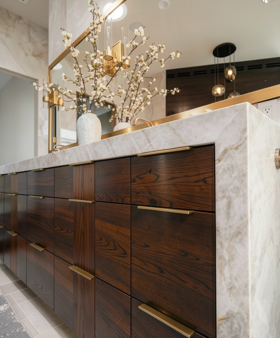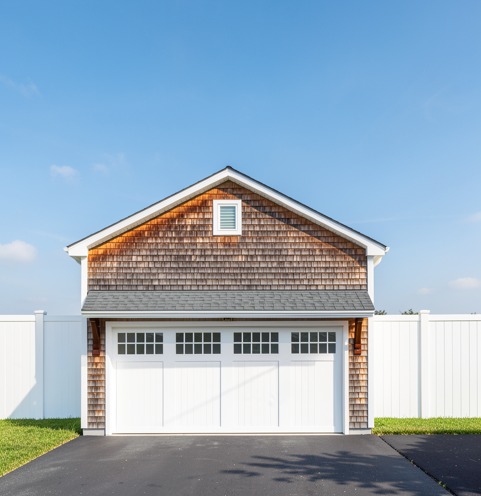weathered cedar shingle siding white trim brown brackets dark grey roofing blue sky 6 foot white fence in background asphalt driveway no houses in background