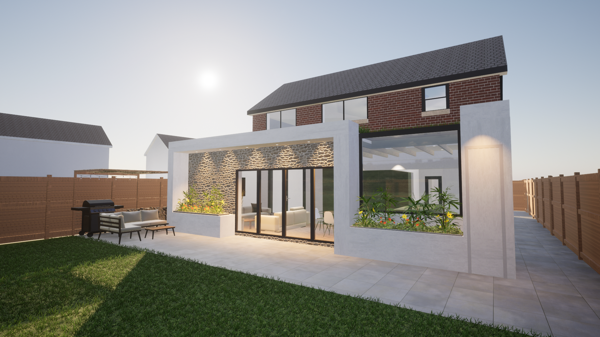 add a black metal cap to the extension roof and add more soft landscaping and more patio furniture and a mum dad and child playing
