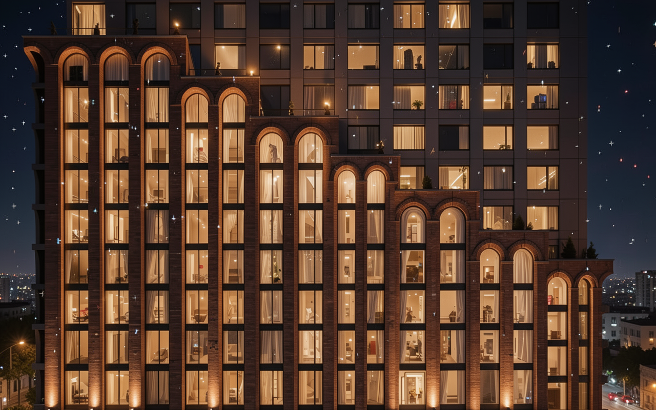 improve this image make it a night scene with random lights on an off throughout the building