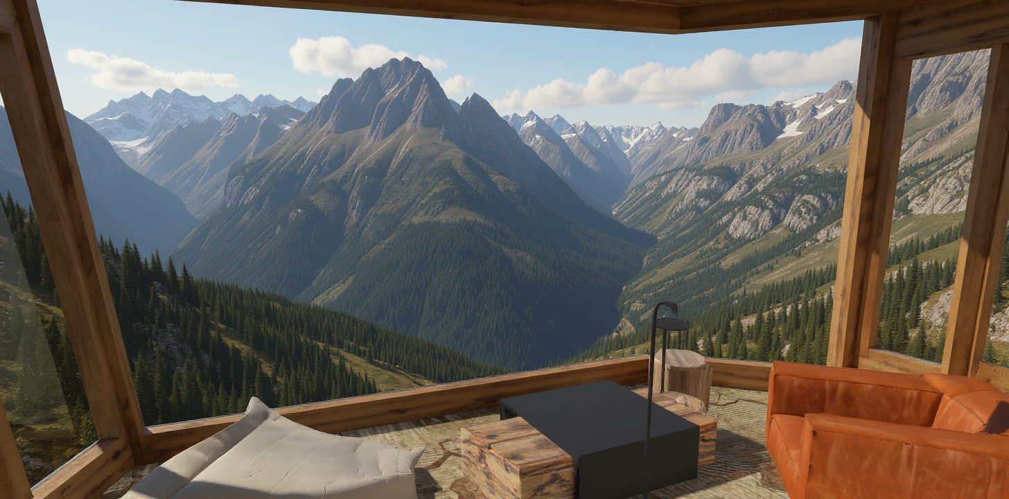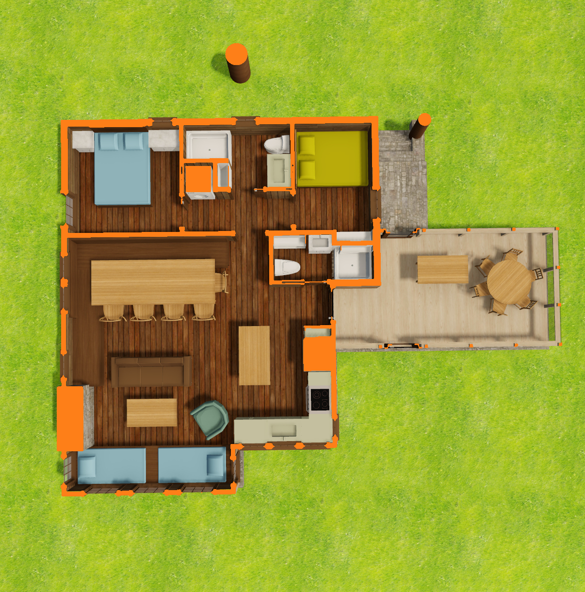 interior shot aerial view floor plan of a cozy cabin the layout features warm wooden flooring main bedroom with a soft blue bed second bedroom with a vibrant green bed living room has sky blue sofas and a brown couch paired with a teal armchair dining area features a long wooden table and chairs outdoor deck with a large round wooden table bright orange walls and architectural borders surrounded by lush verdant green lawns bright and inviting atmosphere illuminated by natural sunlight