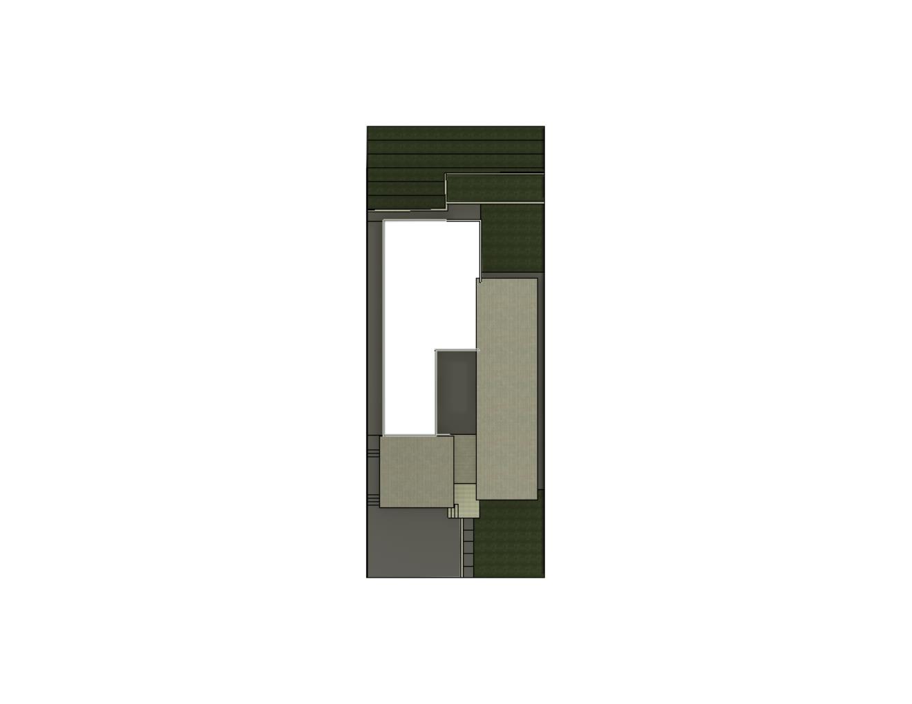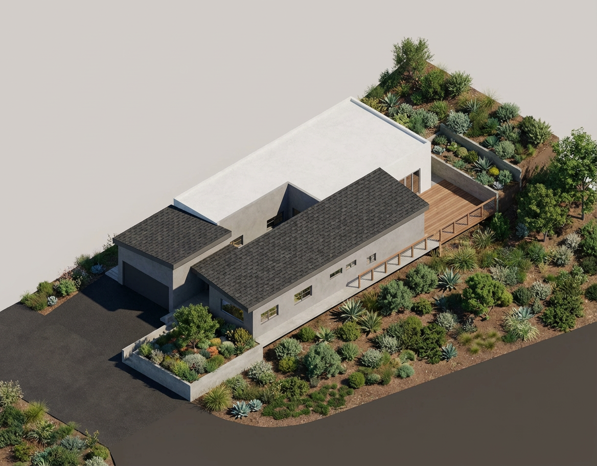 render native californian plantings at the landscape areas use black asphalt shingles for the slope roof areas remove areas outside the provided image