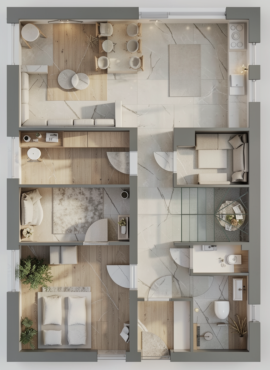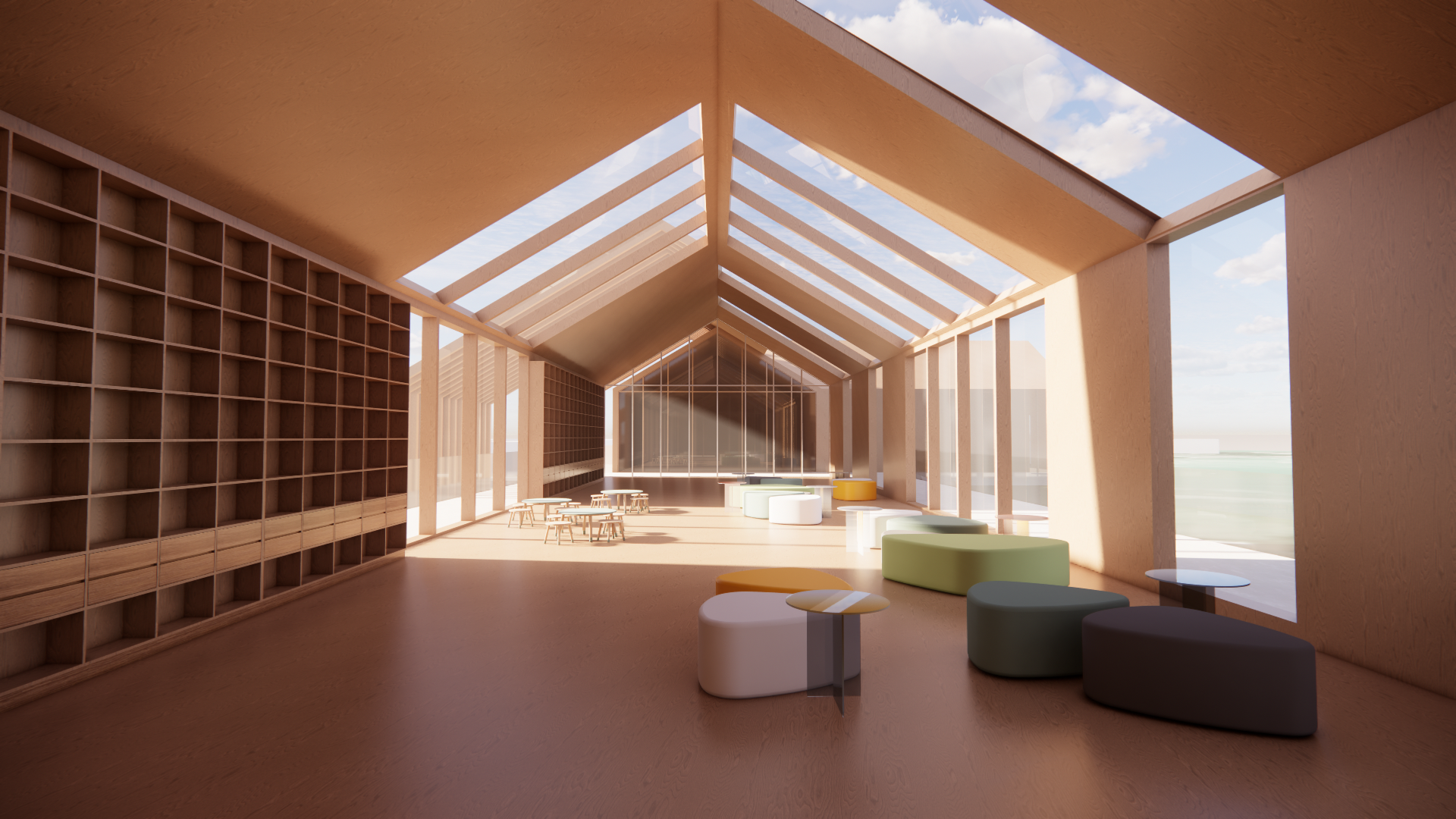 enhance this interior by adding realistic library elements while keeping all architecture completely unchanged do not modify any walls glazing structure ceiling or proportions preserve the full height glazing at the back and sides exactly as shown populate the existing bookshelves with books in a natural varied arrangement books should be realistically scaled with a mix of vertical and horizontal stacks slight irregularity and occasional gaps avoid overly perfect or uniform patterns add additional library furniture to enrich the space while maintaining openness more small tables and chairs arranged in loose clusters a few larger shared work tables soft seating such as poufs and low benches occasional low side tables ensure all furniture is modular lightweight and appropriate for an elementary school environment keep layouts flexible and not overly dense maintain clear circulation paths add warm minimal lighting suspended pendant lights aligned with the structural rhythm subtle integrated lighting within bookshelves soft realistic daylight remains dominant from skylights and glazing keep all elements properly scaled for a space with a 20 foot ceiling do not exaggerate size use a cohesive palette of warm wood soft neutral flooring and muted accent colors maintain a calm contemporary scandinavian inspired educational atmosphere no people no clutter no changes to architecture only add elements to enhance realism and program