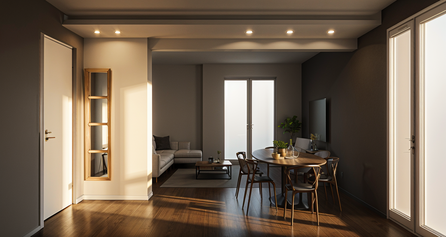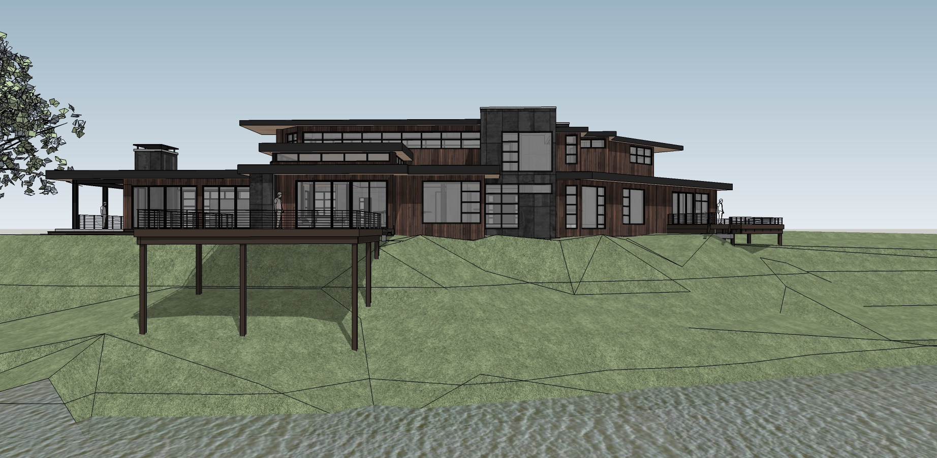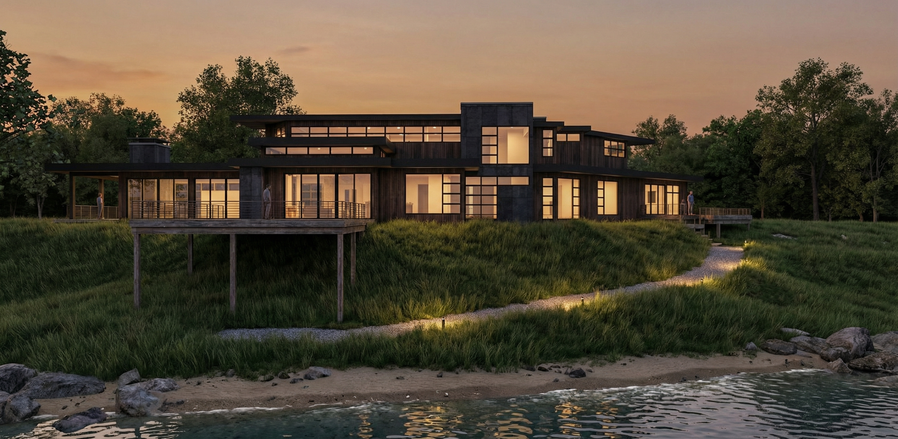 industrial home design tall grass with lighted path on a hill shoreline foreground trees in background dusk soft interior lighting