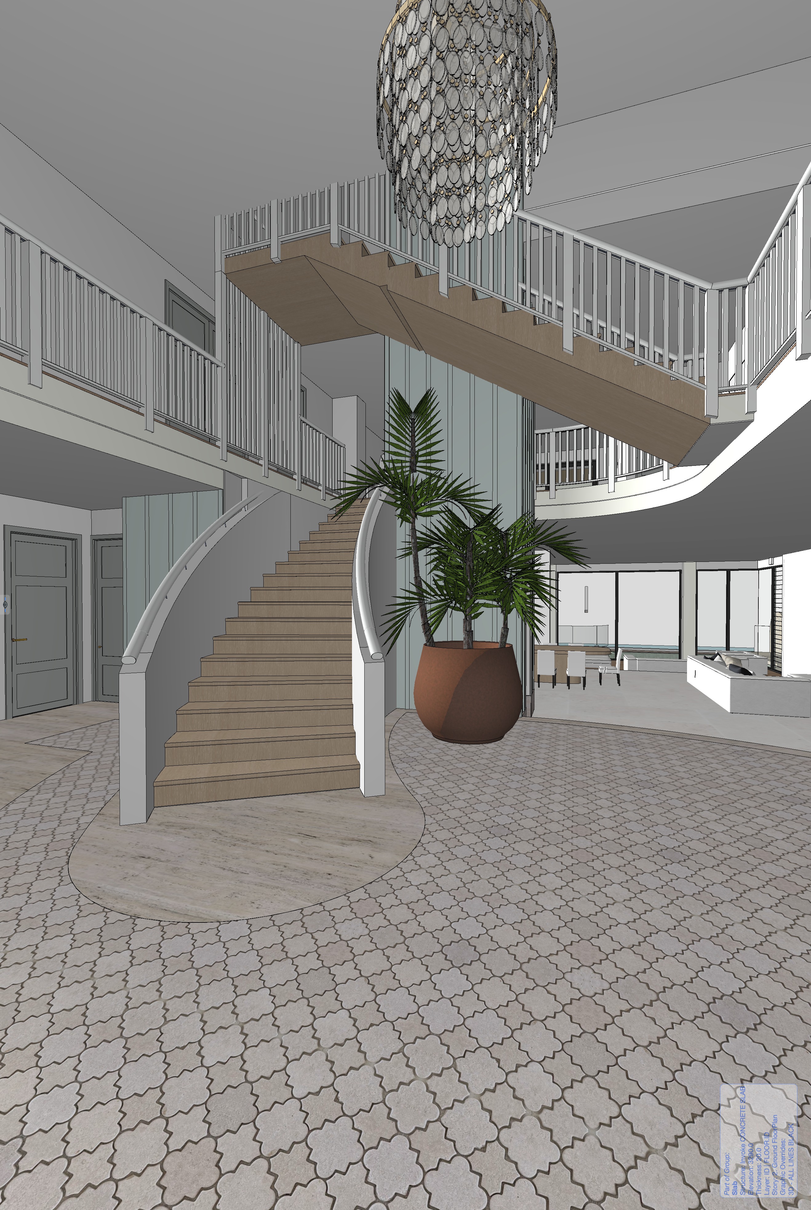 use the provided archicad 3d entry hall model image as the reference and transform it into a photorealistic architectural render do not modify the existing design layout materials fixtures or proportions maintain the exact geometry preserving the entry hall 2 steps height difference between the the hall and the living area keep all flooring around the stairs flush with hall mosaic add light coming from behind the camera improve realism by adding high quality materials realistic lighting shadows reflections and subtle imperfections typical of real interior photography add a back ground of gold coast canals view through the windows the background should feel integrated into the overall design and consistent with the scale of the windows enhance the render with natural daylight entering through the window soft ambient lighting global illumination and physically accurate materials add sunlight coming through from behind the camera style photorealistic architectural visualization ultra realistic interior render soft daylight high end entry hall photography 4k detail preserve the camera angle perspective and composition from the original archicad view