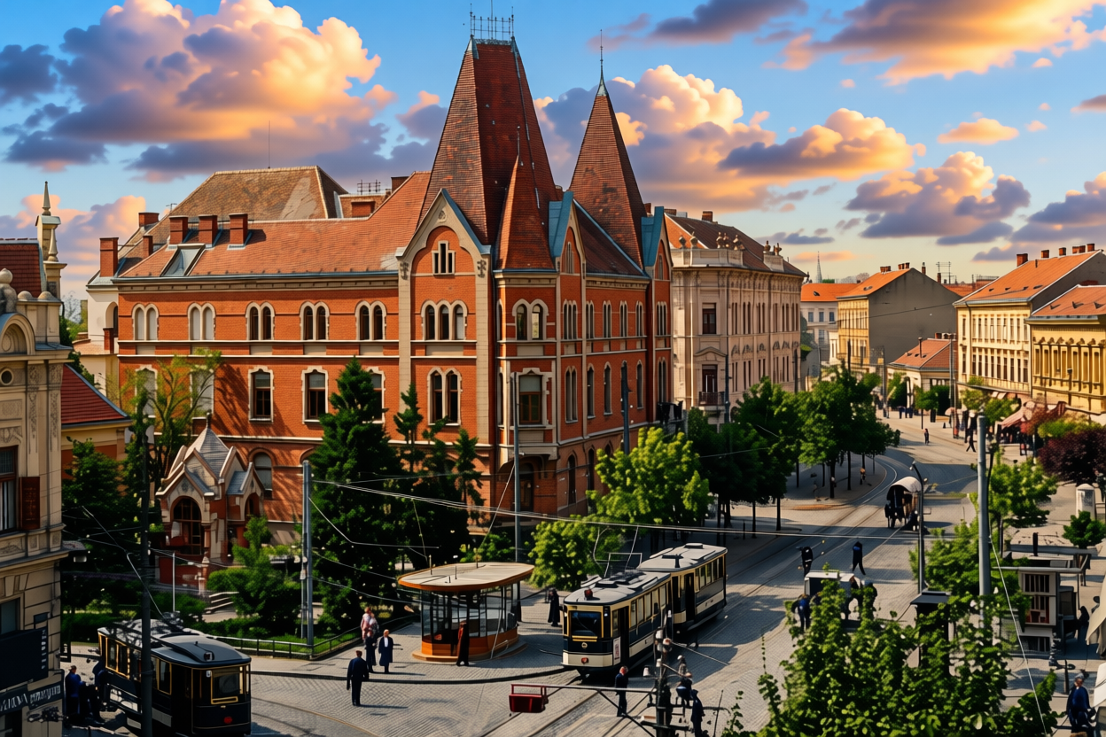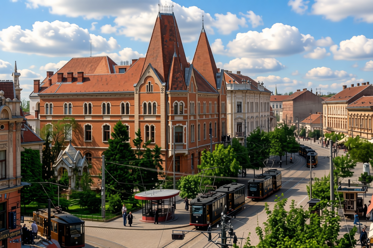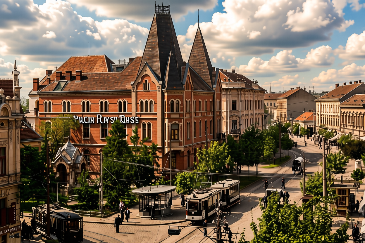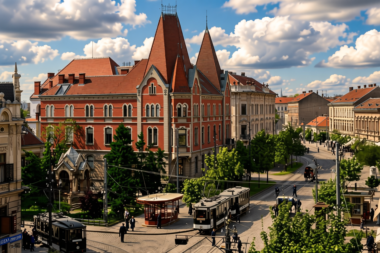 remove text from top and bottom of the picture leave text if it exist on the midle range of the picture beautyful clouds cinematic view 1900 s atmosphere black with white coloured trams more lenlighted hyperlight in the shadows